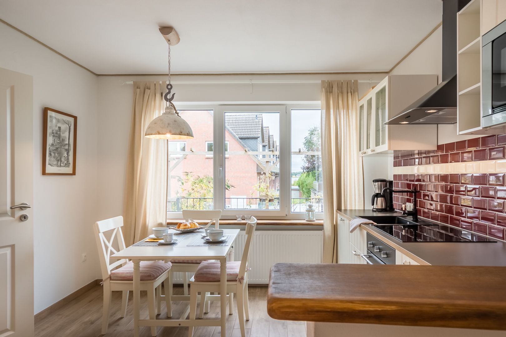 Der 1. Eindruck war sehr angenehm, rein kommen, Wohlfühlen. Wohnung war sauber. Stilvoll eingerichtet, helle freundliche Räume. Wohnbereich gemütlich. Küche komplett eingerichtet (mit allen Gerätschaften die man braucht, Geschirr und Kochutensilien, Besteck --> top). Bad ist klein aber vollkommen ausreichend (große Dusche, ebenerdig).