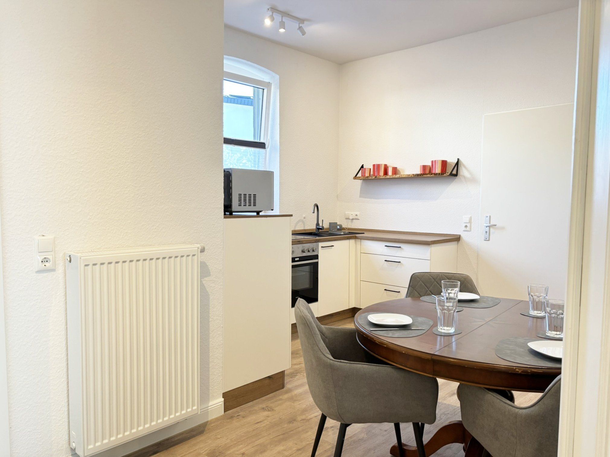 Essbereich mit angrenzender Küche: Esstisch mit 4 Stühlen, Mikrowelle, Cerankochfeld, Backofen, Kühlschrank mit Gefrierfach, Filterkaffeemaschine und Padmaschine, Wasserkocher, Toaster.