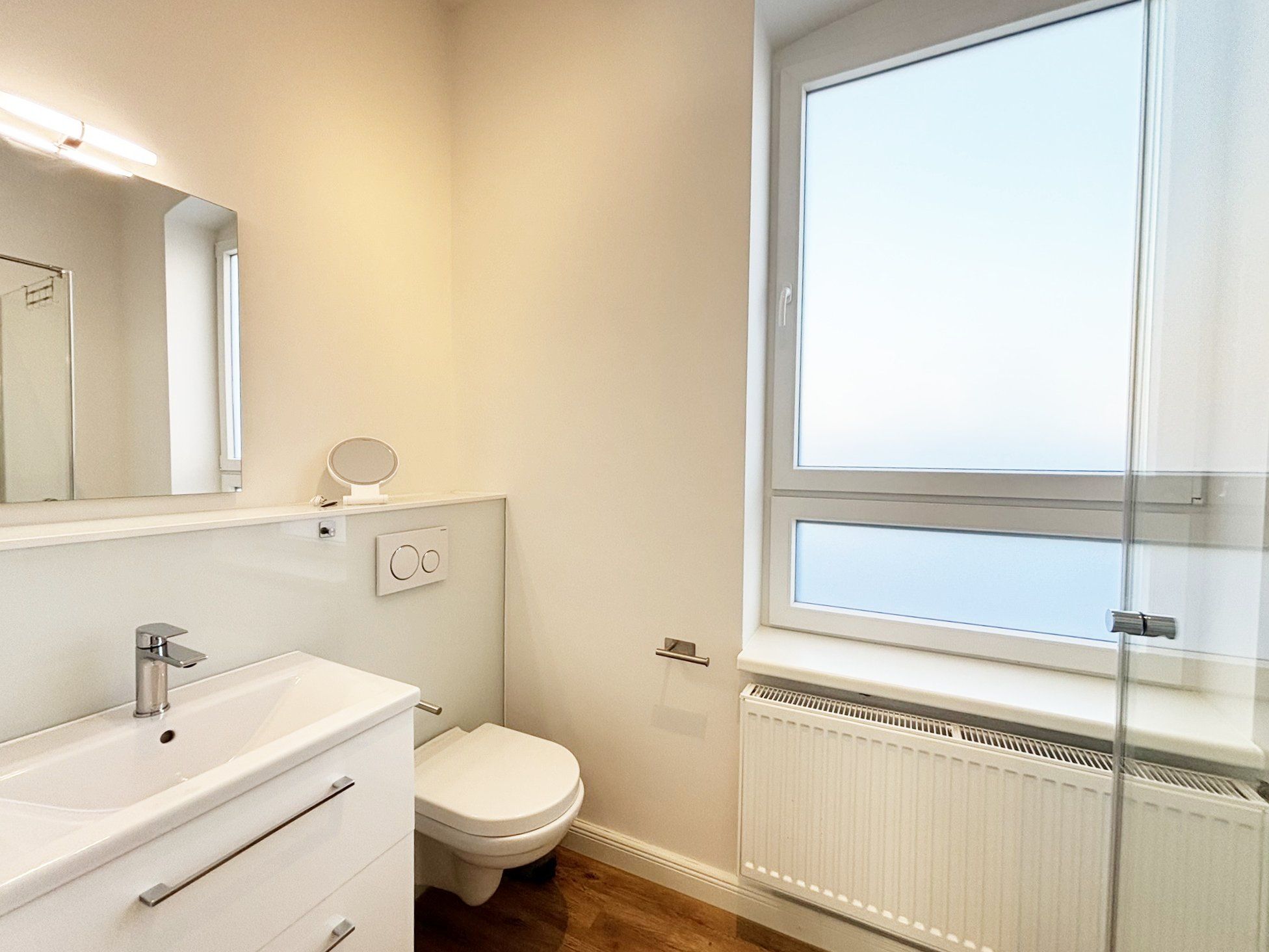 1 Badezimmer: Dusche mit 10 cm hohem Einstieg, WC, Haartrockner, Spiegel, Waschbecken und Fenster.