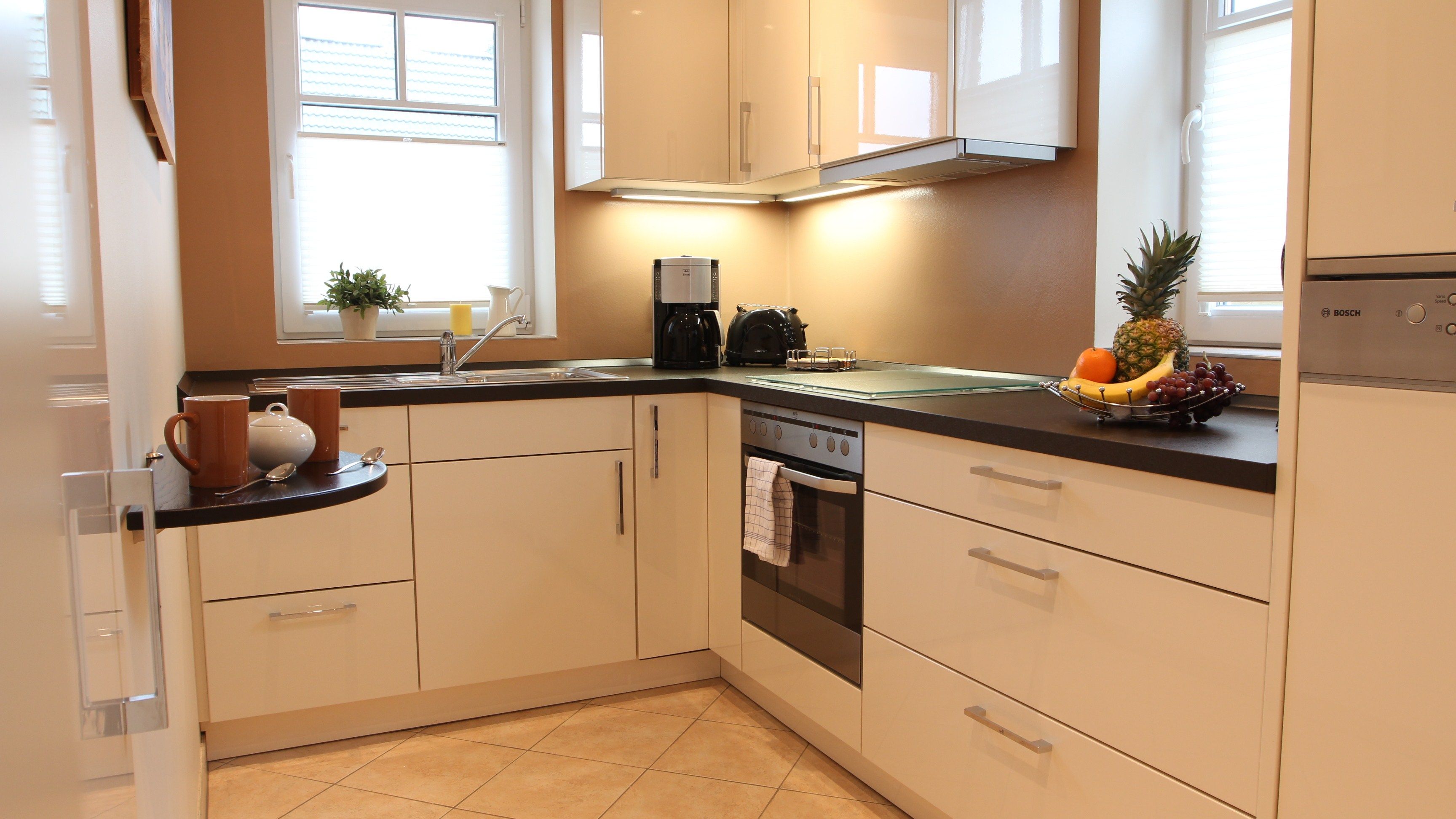 Moderne Einbauküche mit Ceranfeld, Backofen, Dunstabzugshaube, Mikrowelle, Kühlschrank mit 4-Sternefach, Geschirrspüler, Toaster, Eier- und Wasserkocher, Kaffee- und Espressomaschine (Tchibo Cafissimo Kapseln).
