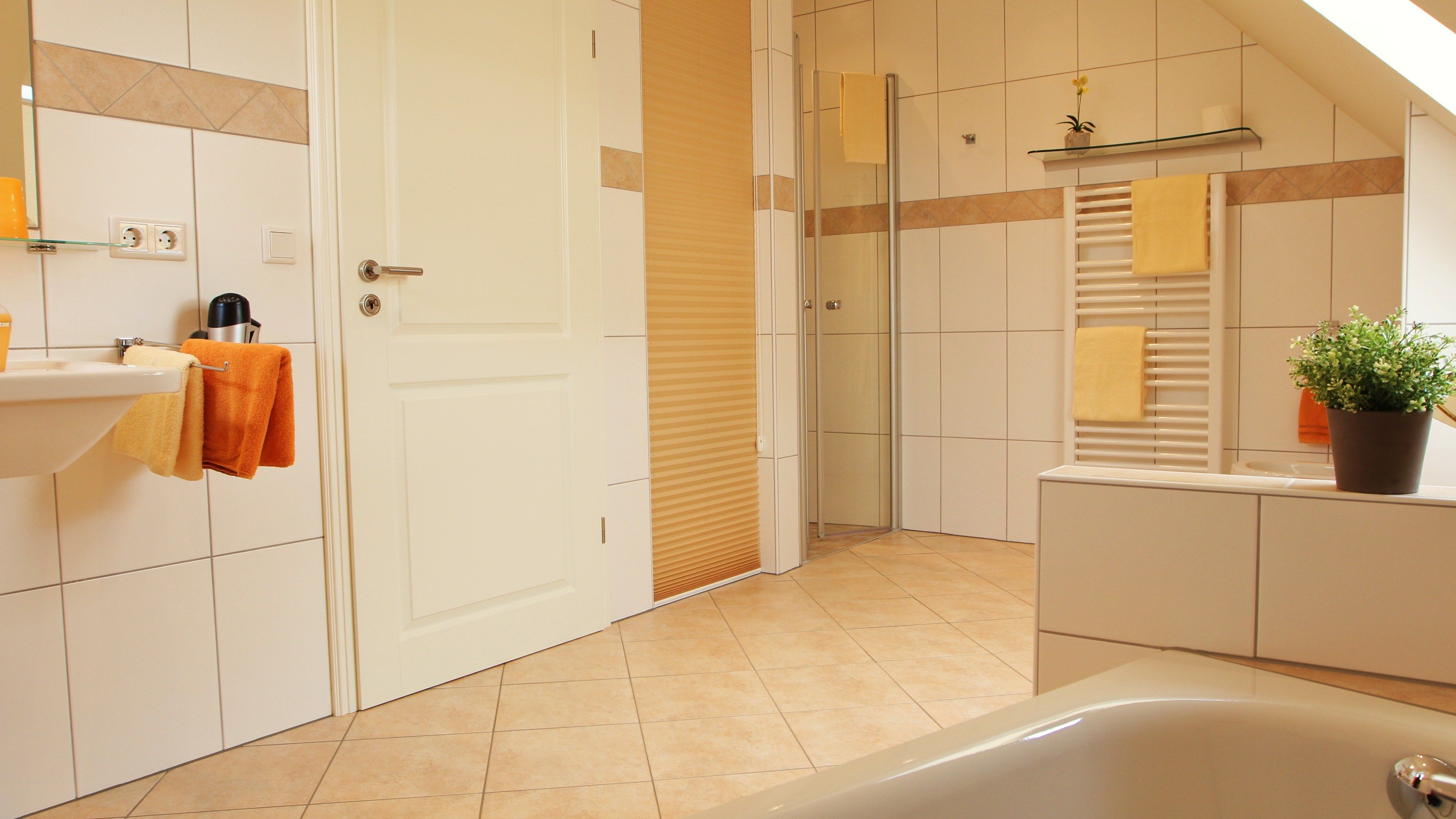 1 hochwertiges Badezimmer mit WC, Bidet, Dusche und Wanne, Handtuchtrockner und Fön.