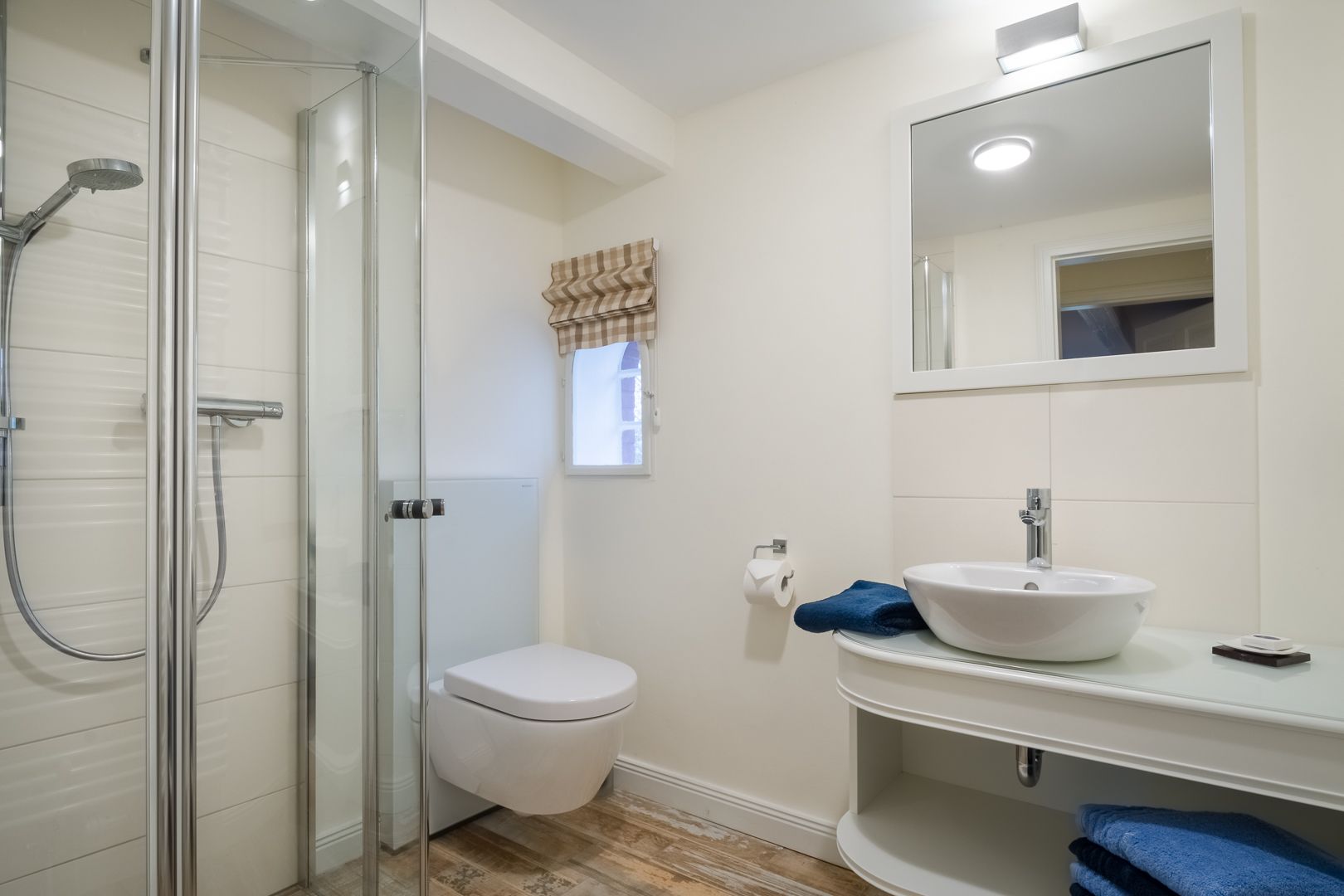 Das Duschbad mit WC ist funktional und hochwertig ausgestattet. Die Fußbodenheizung sorgt besonders an kühleren Tagen für angenehme Wärme und einen guten Start in den Tag.