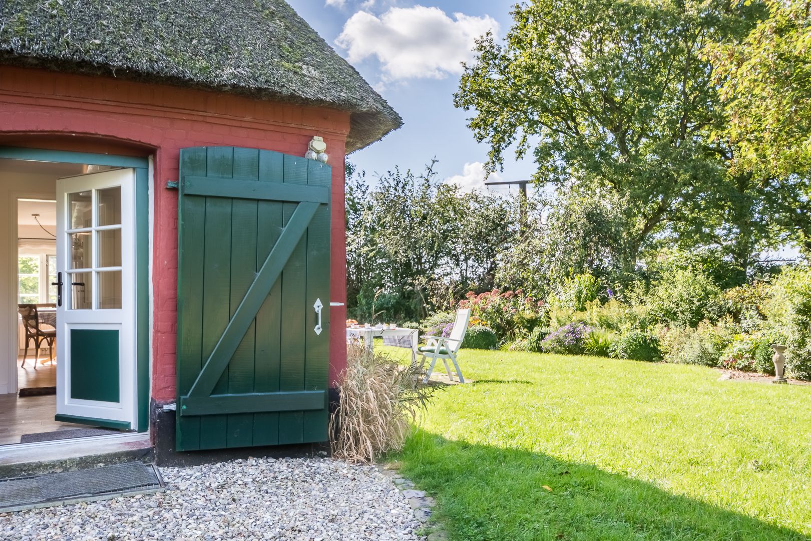 Die Süd-West-Terrasse mit Bestuhlung ist der perfekte Ort für sonnige Nachmittage und lange Abende. Der Garten darf mitgenutzt werden und bietet viel Raum zum Verweilen. Auf dem Grundstück befindet sich ein nicht umzäunter Teich – ruhig gelegen und natürlich in das Gesamtbild eingebettet.