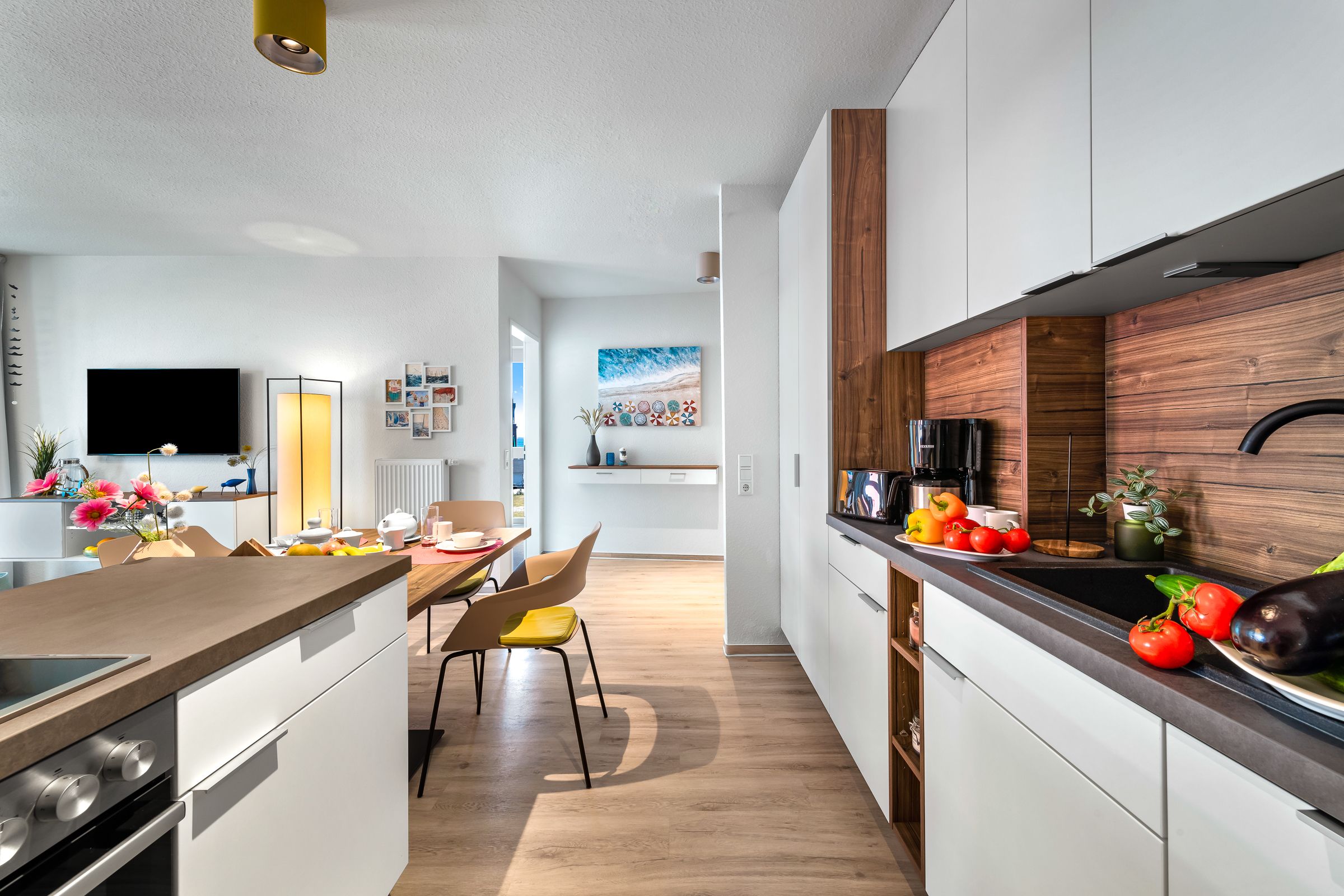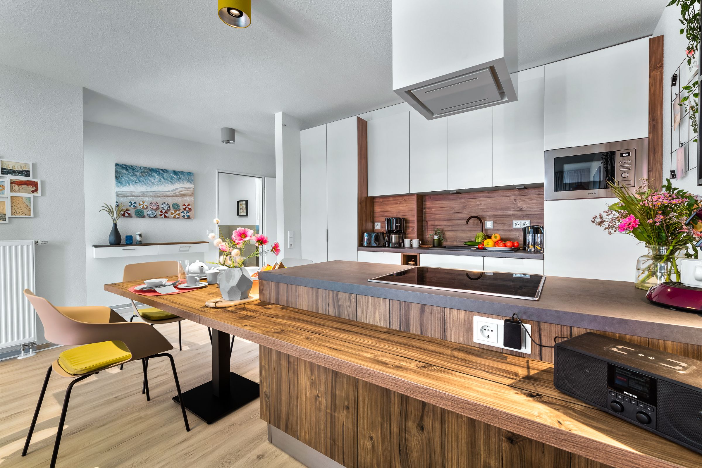 Wohn- und Essbereich mit offener Küche (Mikrowelle, Cerankochfeld, Backofen, Kühlschrank mit Gefrierfach, Geschirrspüler (45cm), Filterkaffeemaschine und Kaffeepadmaschine (Senseo),Wasserkocher, Toaster, Handrührgerät).