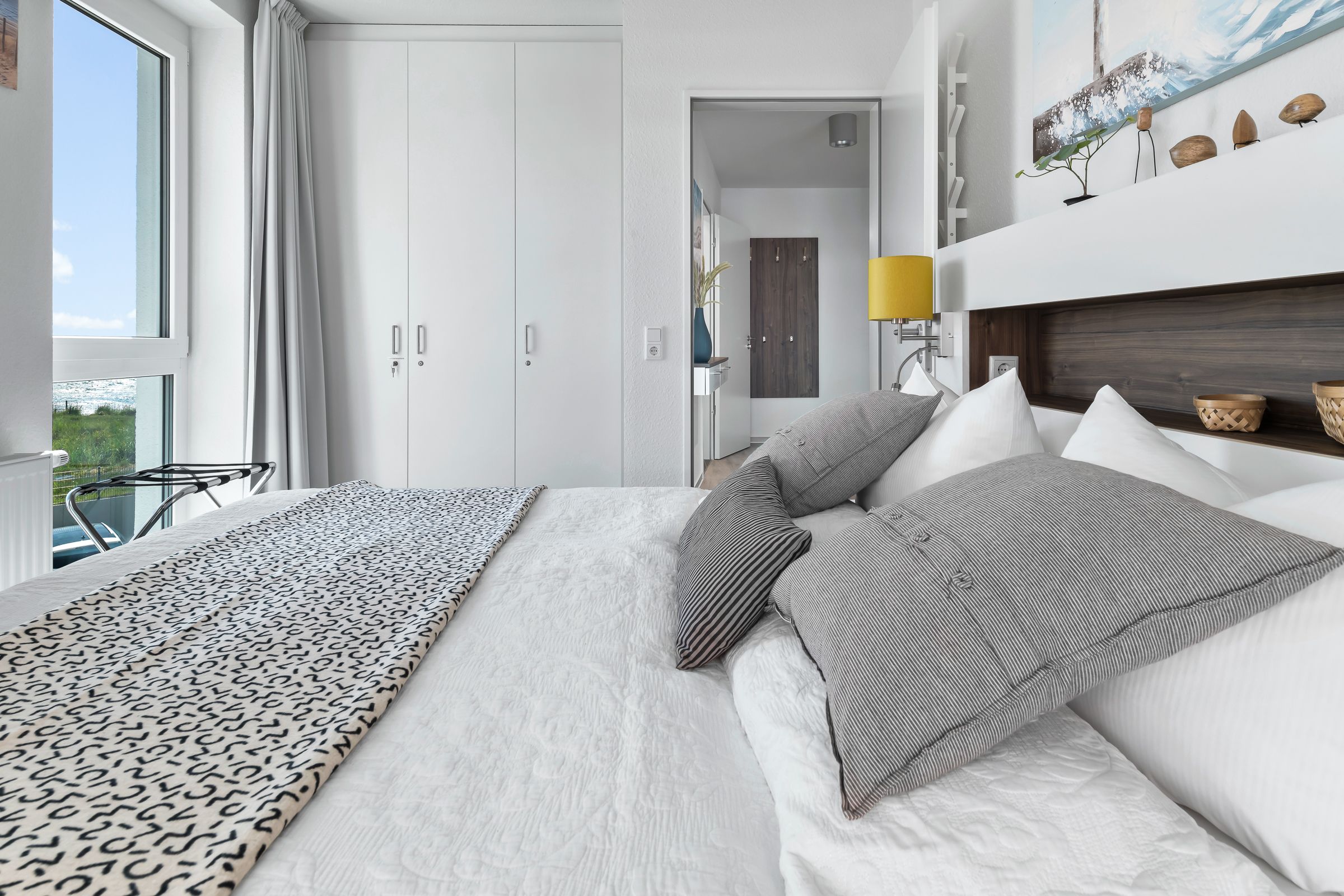 Ein Schlafzimmer mit Boxspringbett (2x90x200cm) - können auch separat voneinander gestellt werden - und Kleiderschrank - zwei weitere Schlafmöglichkeiten bieten die beiden Schlafsofas (85x220cm) mit Lattenrostauflage im Wohnbereich..