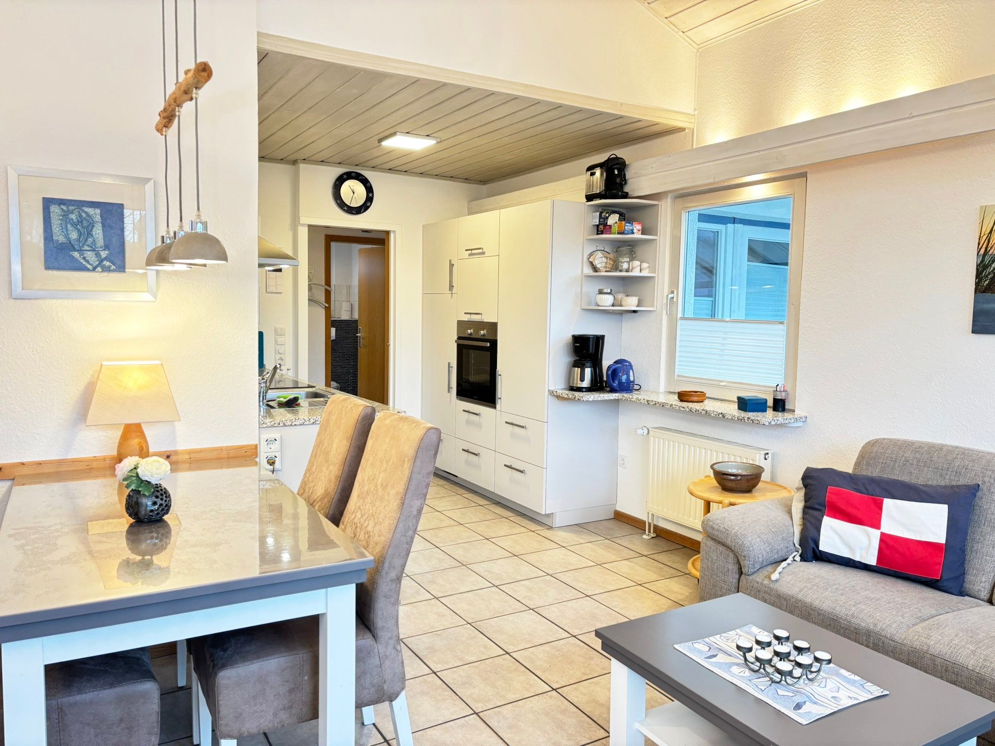 offene Küche: Mikrowelle, Cerankochfeld, Backofen, Kühlschrank, Gefrierfach (Fach im Kühlschrank), Spülmaschine, Filterkaffeemaschine, Tassimomaschine, Wasserkocher, Handrührgerät und Toaster.
