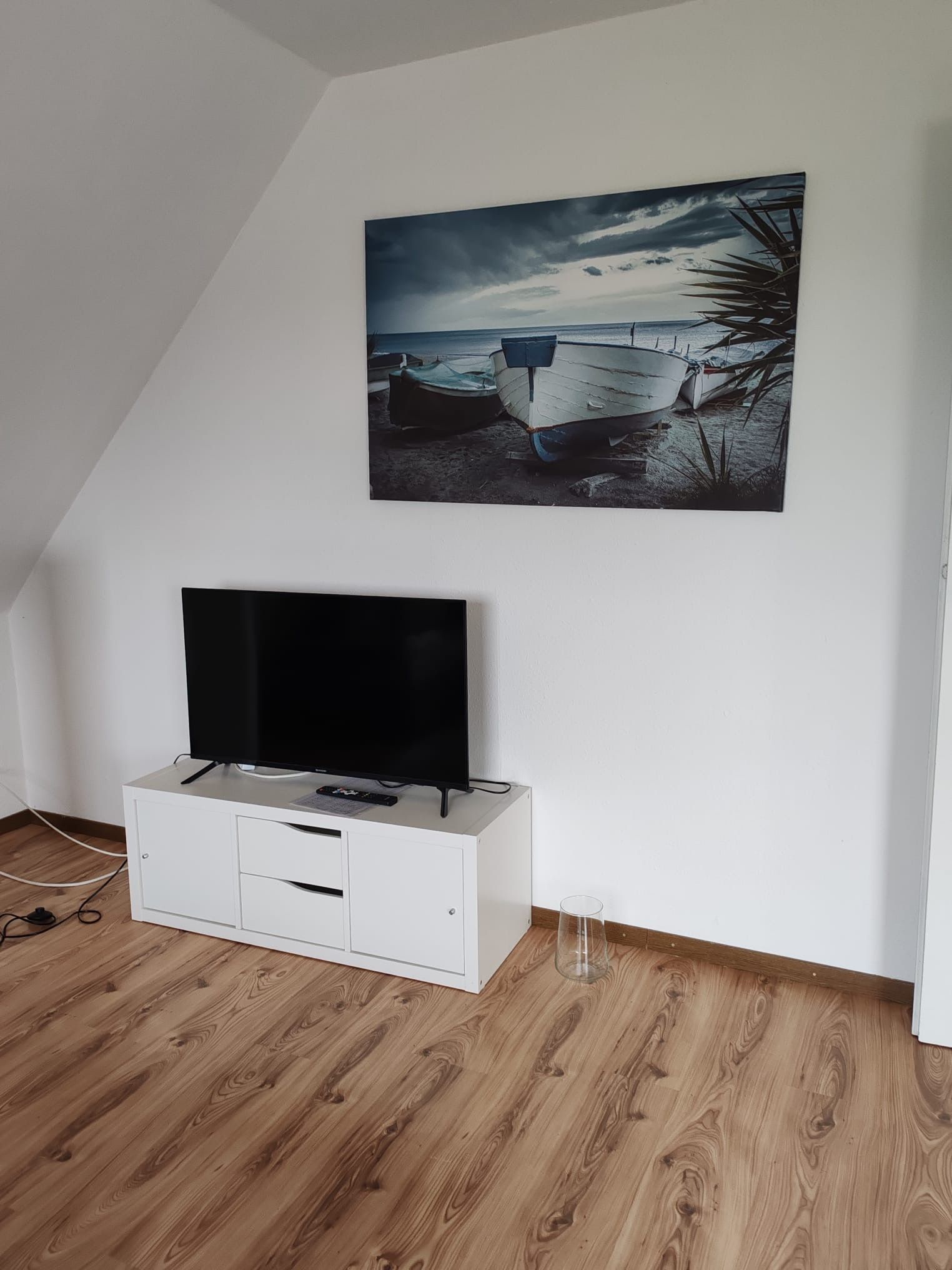 Wohnzimmer mit Sofa, TV, Kommode und Garderobe.