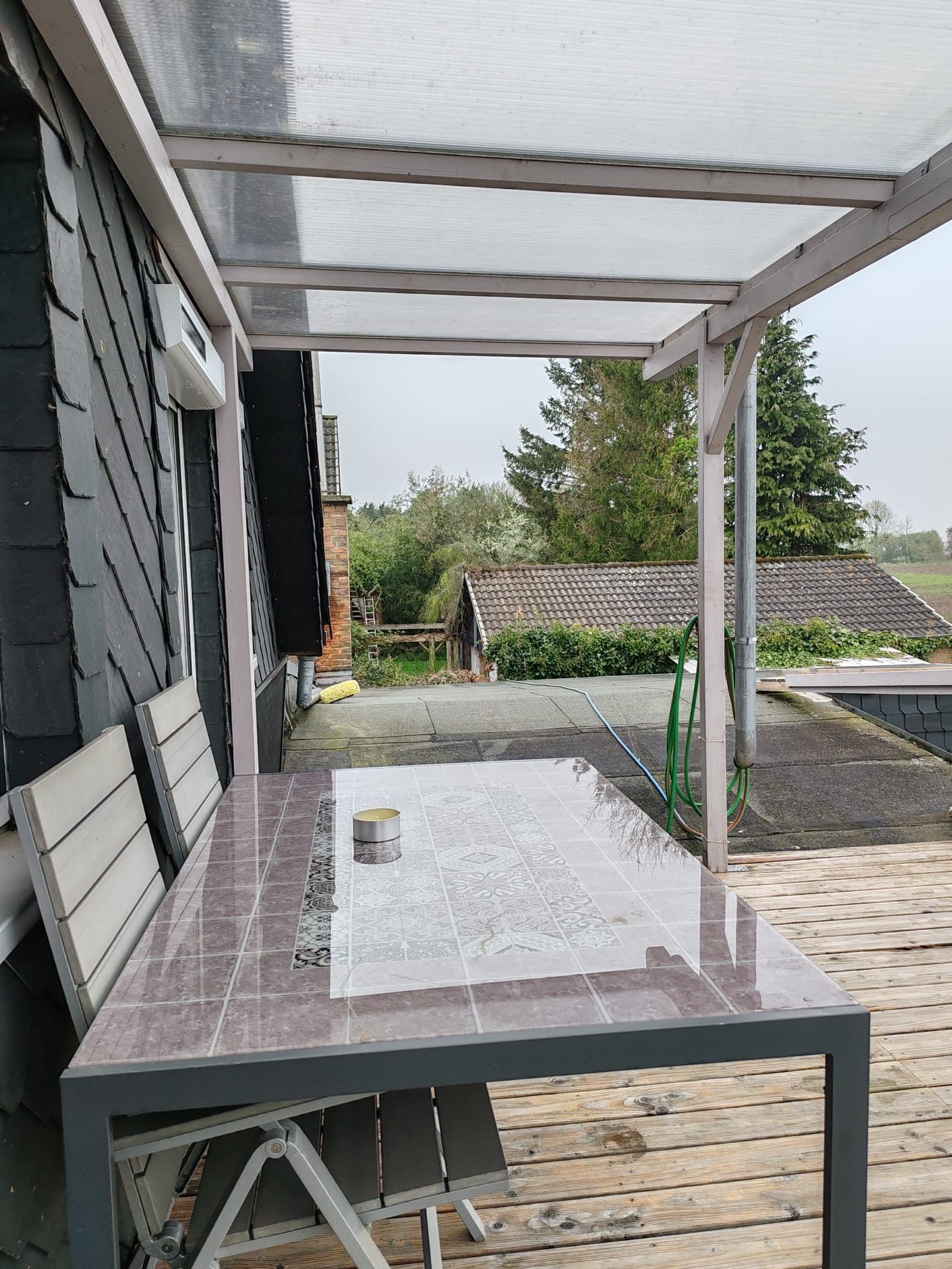 Außenbereich: überdachter Balkon, 2 Sonnenliegen, Gartenmöbel und Sonnenschirm.