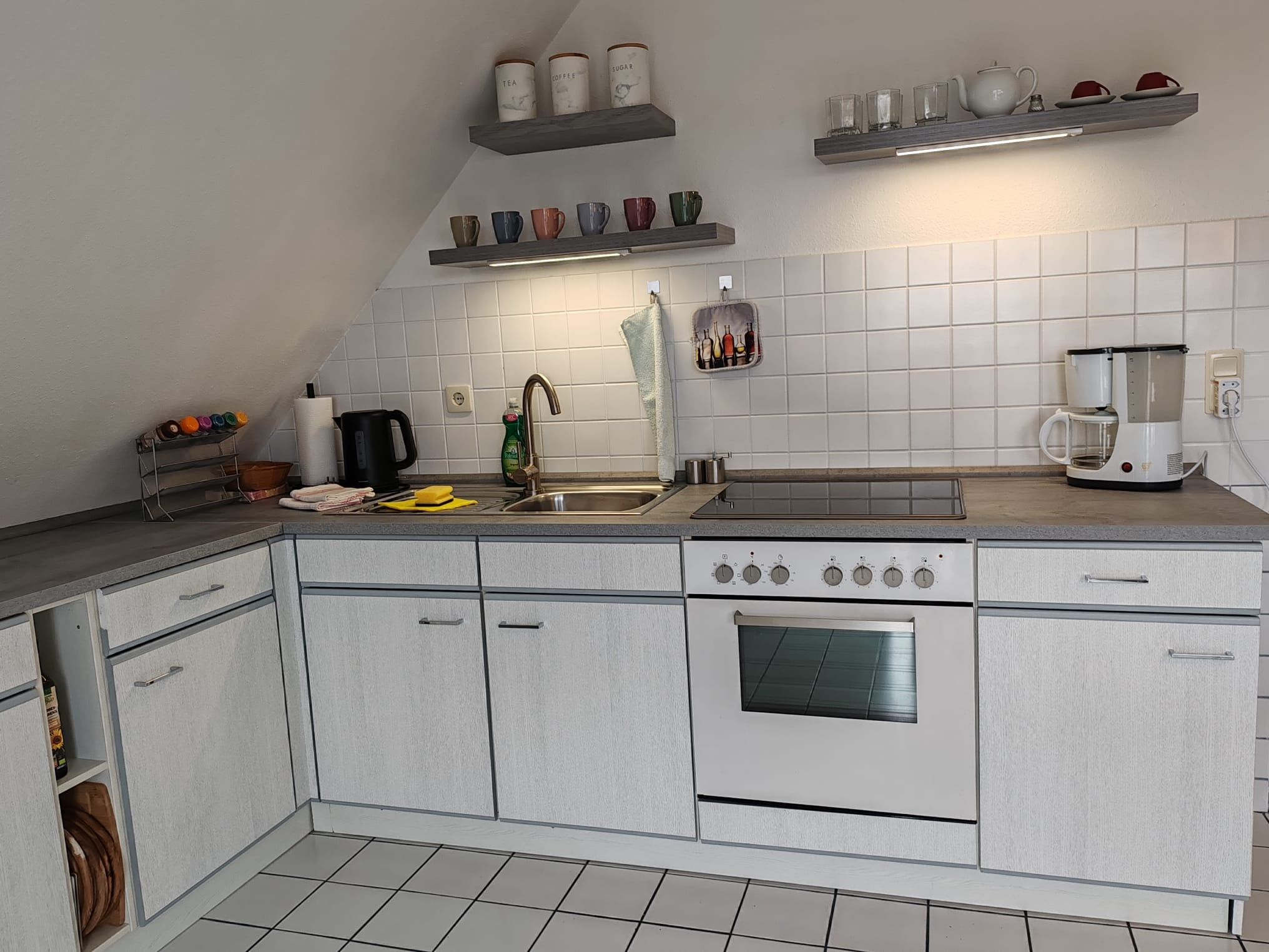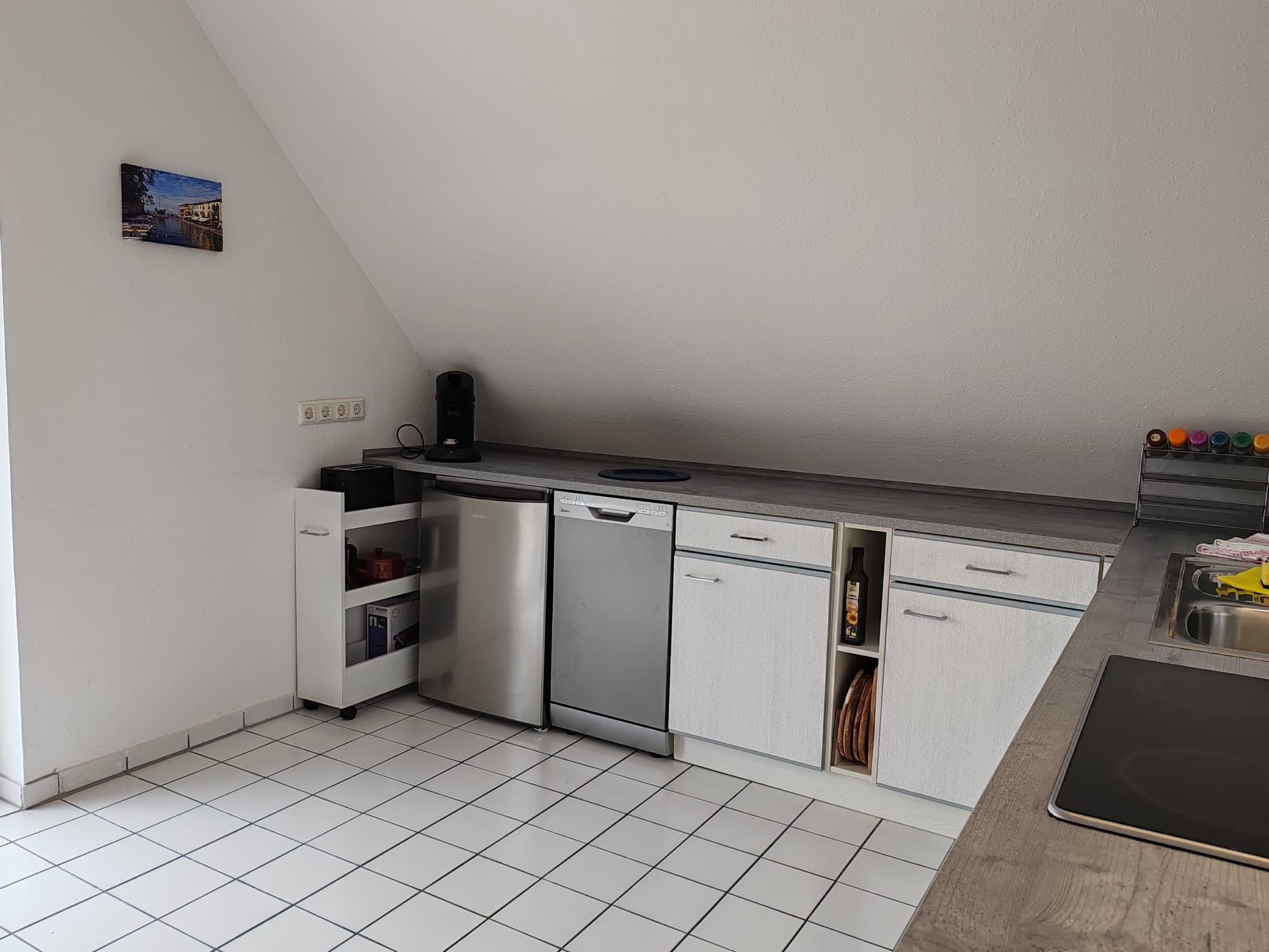 separate Küche: Kaffeevollautomat, Mikrowelle, Cerankochfeld, Backofen, Kühlschrank mit Gefrierfach, Spülmaschine, Wasserkocher, Toaster, Elektrogrill, Kaffeemaschine und Kaffeepadmaschine.