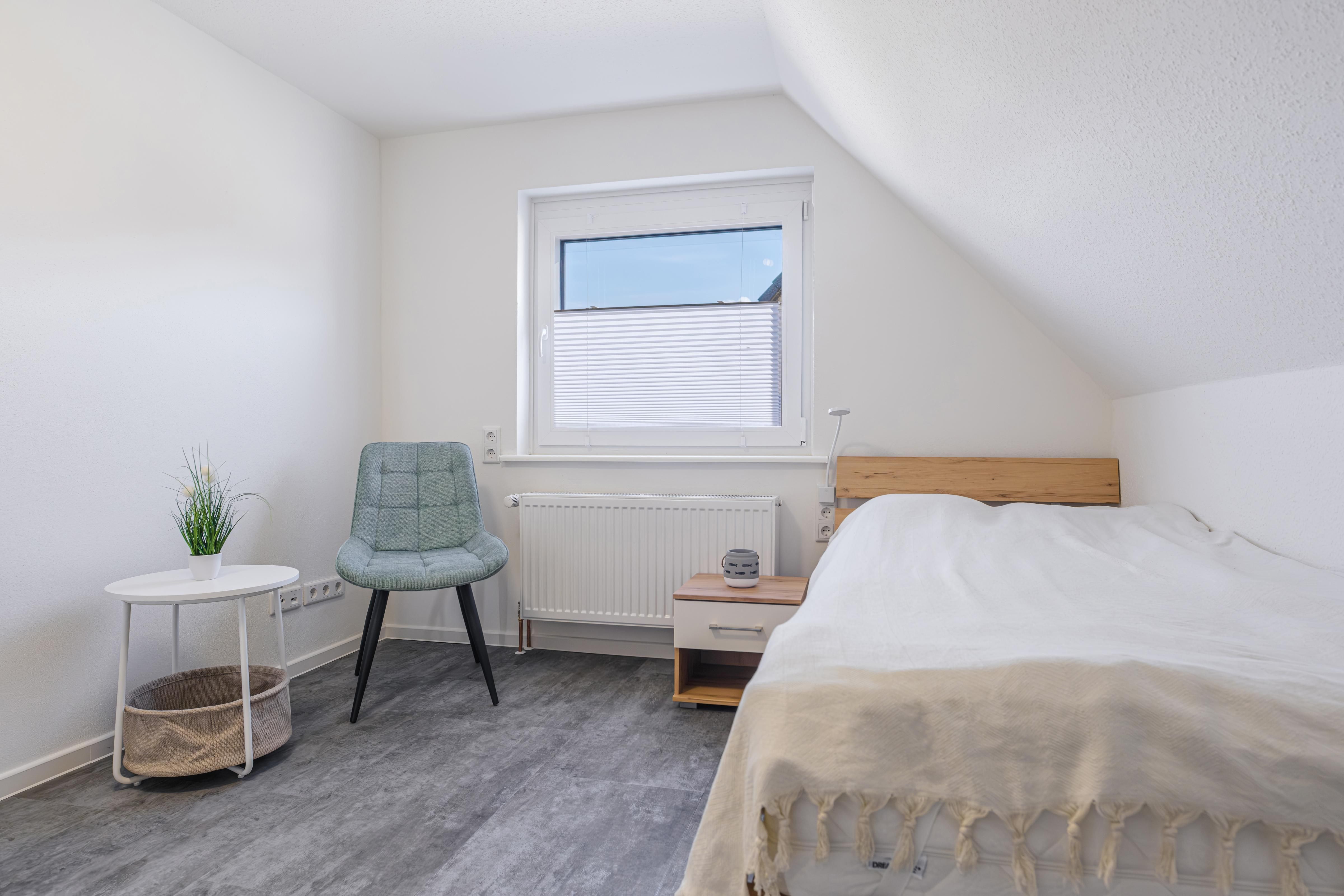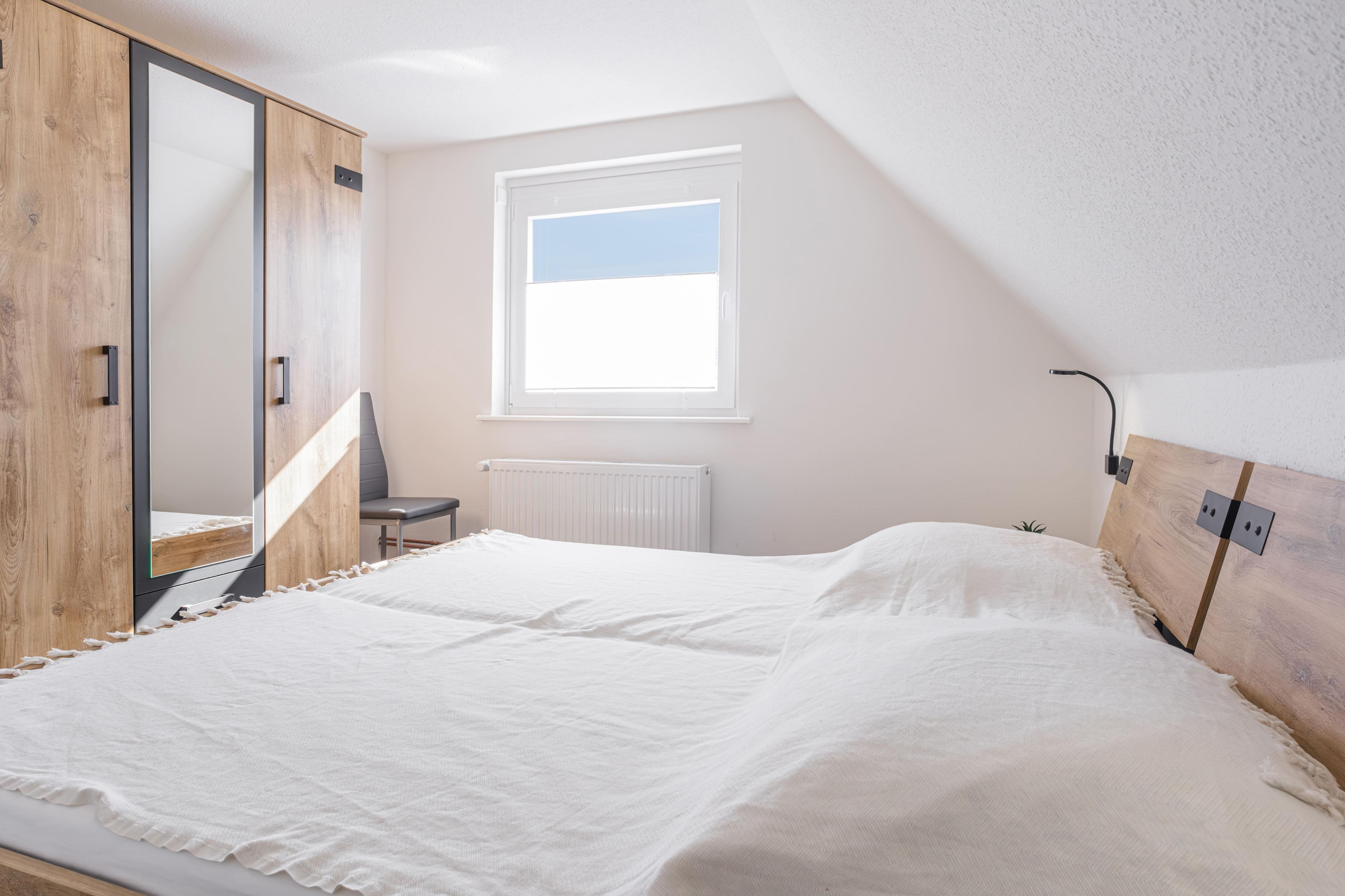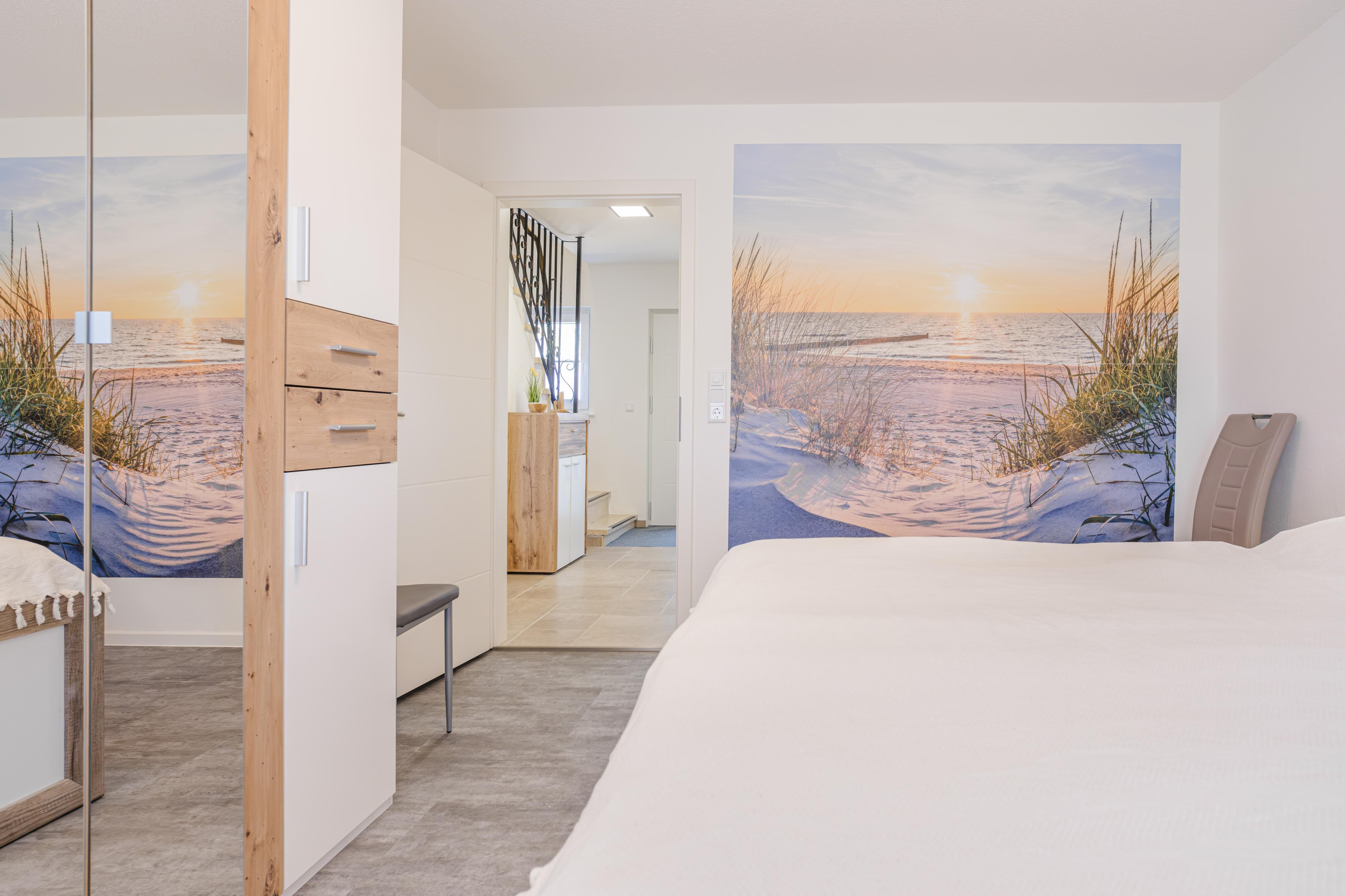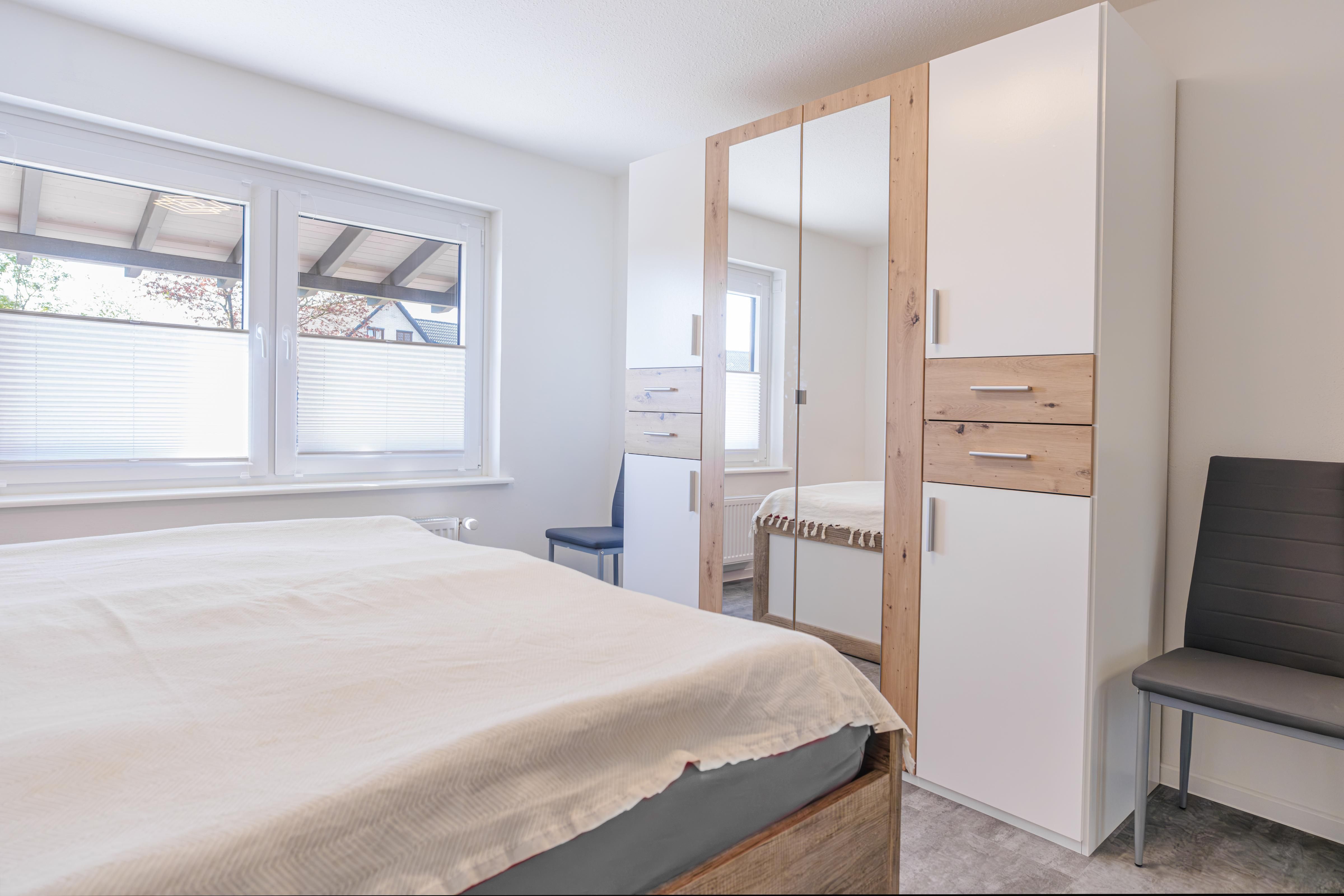 Schlafzimmer 1: Doppelbett (190x200 cm), getrennte Matratzen, offenes Fußende, Kleiderschrank, elektrische Verdunklungsmöglichkeit.