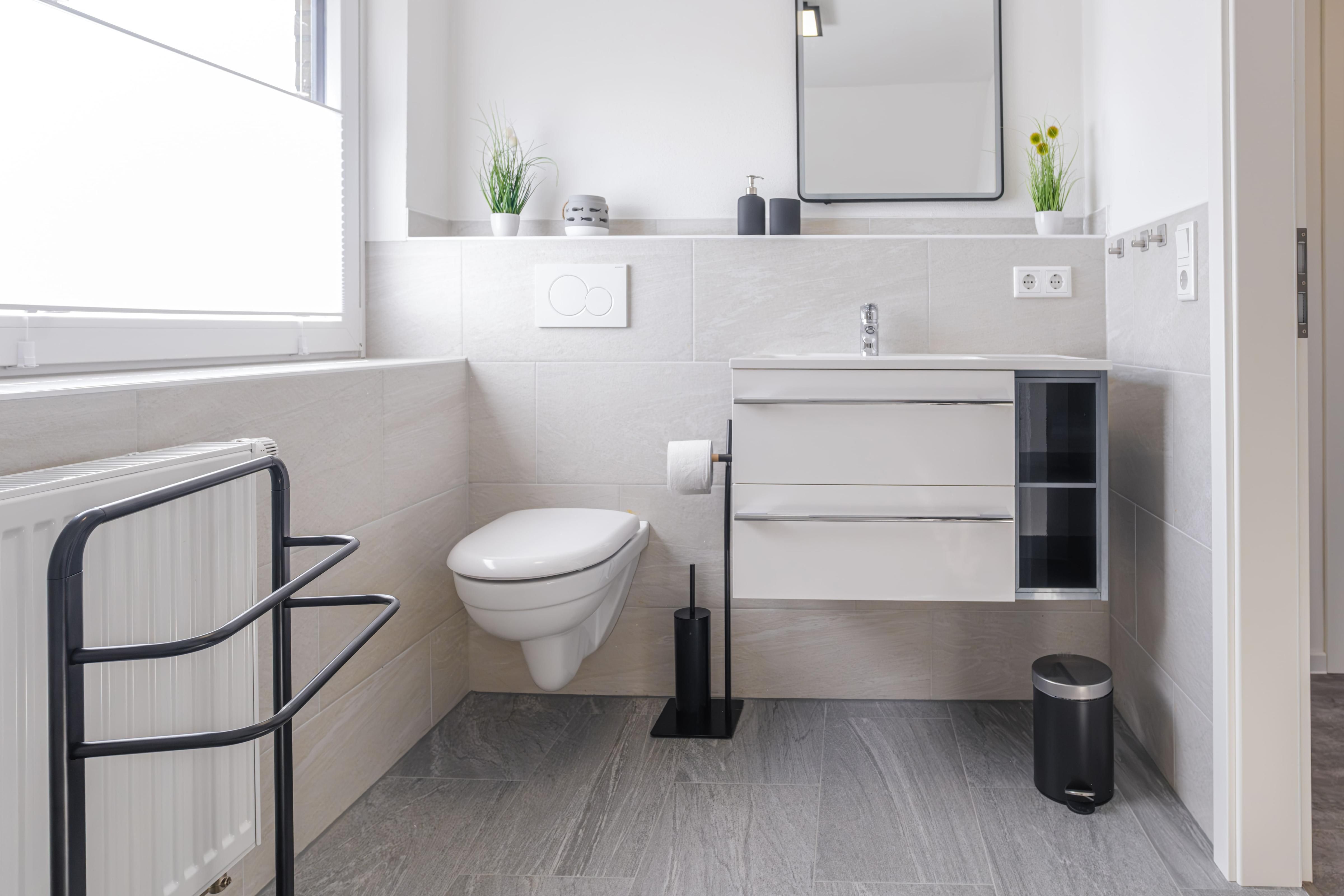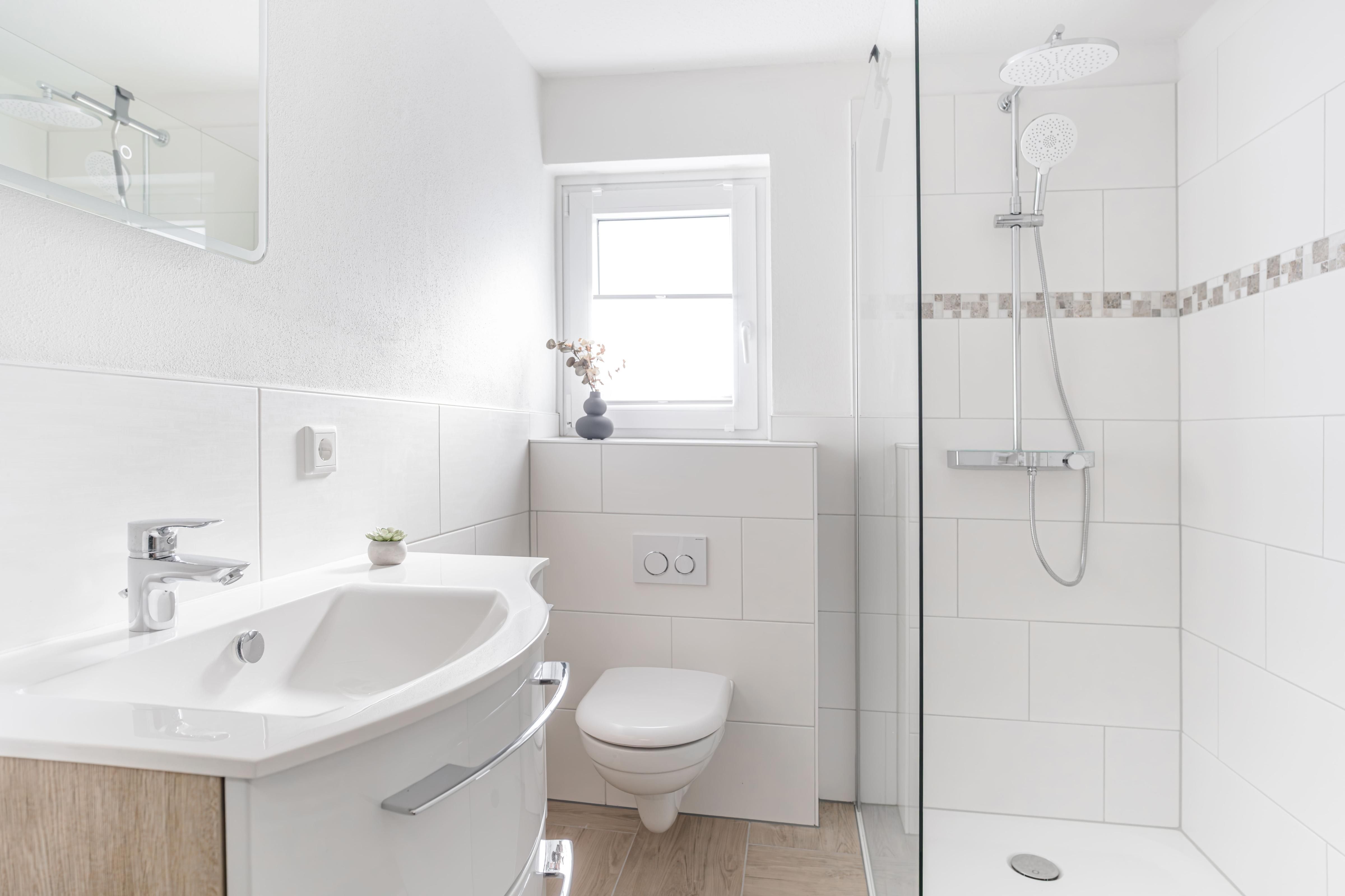 Badezimmer 1: ebenerdige Dusche, WC, Spiegel, Fenster, Waschbecken.