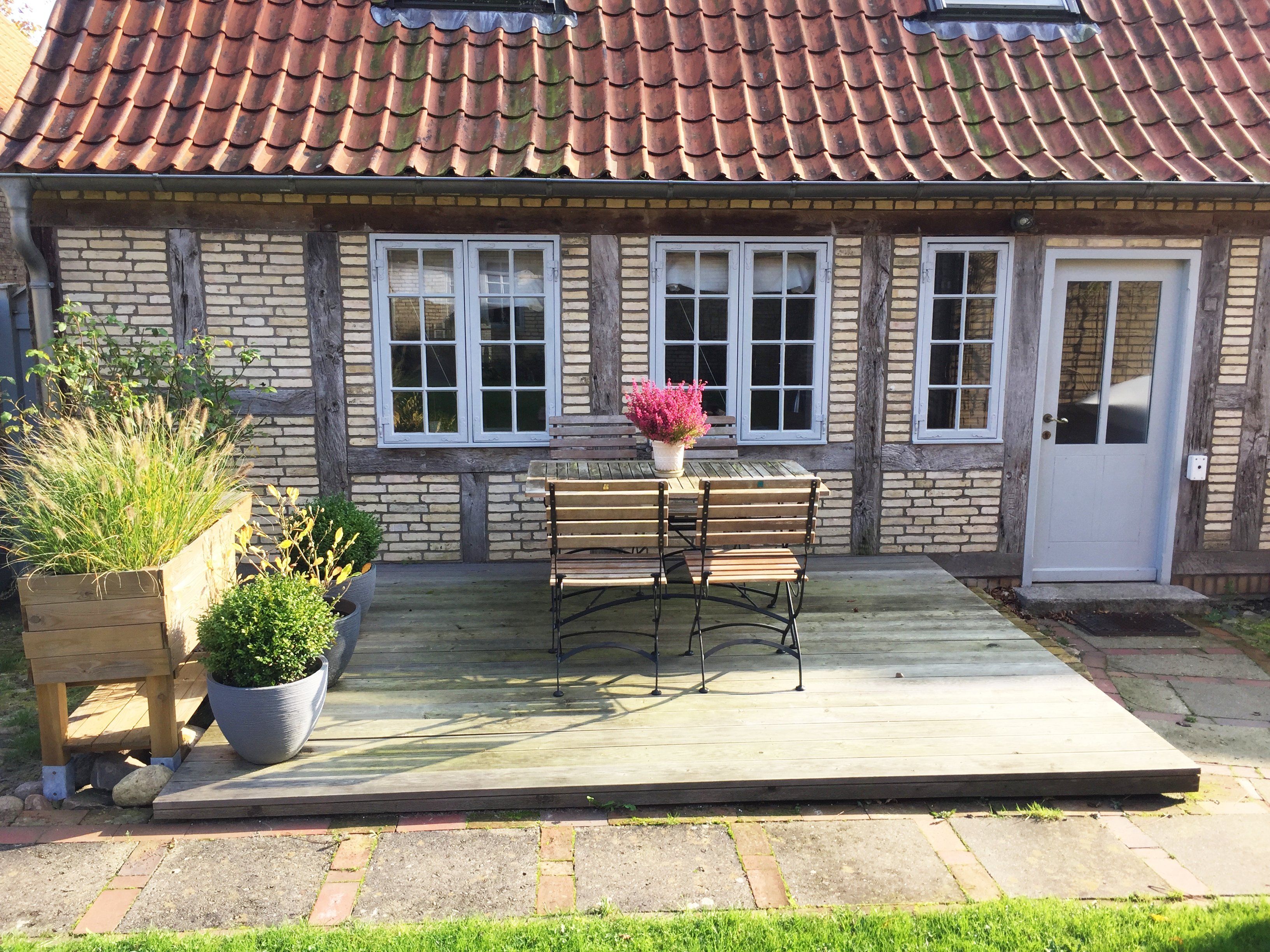 Außenbereich: eigene Terrasse nut Gartenmöbeln und Sonnenschirm + Gemeinschaftsgarten (Teich) mit Liegewiese und Sonnenliegen