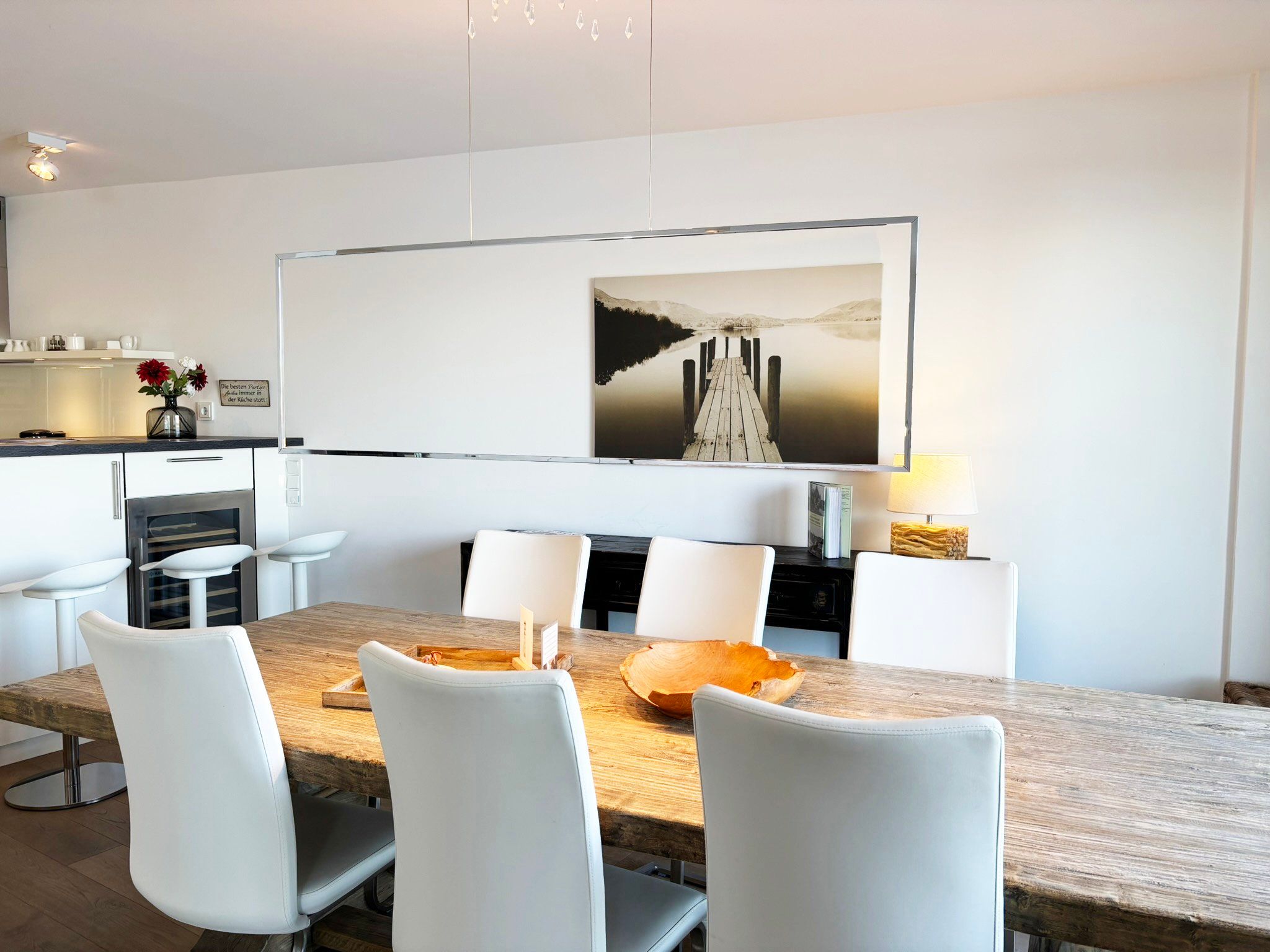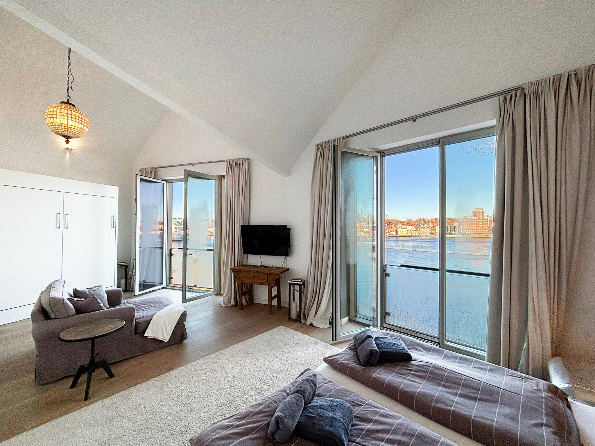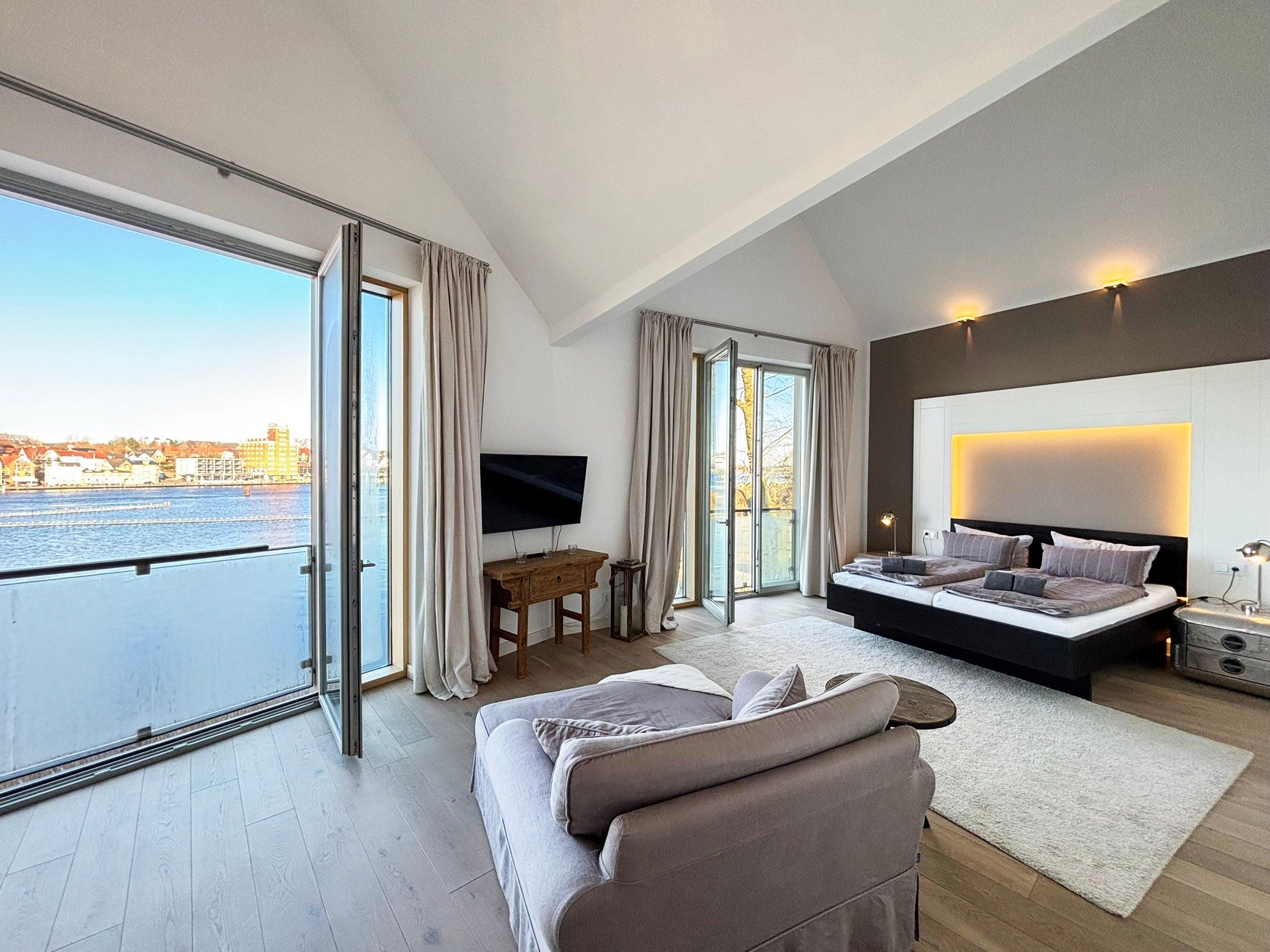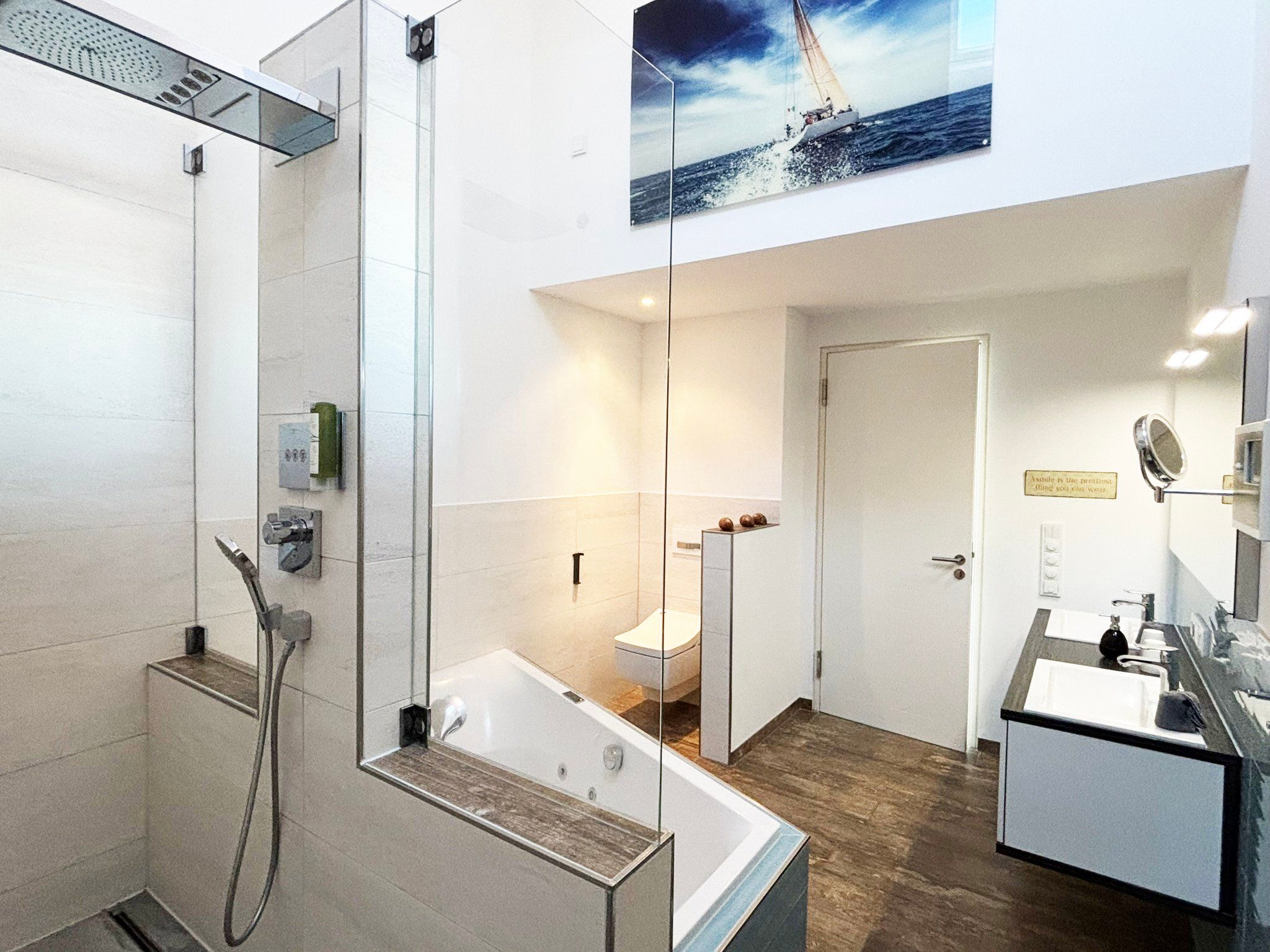 Eine sehr schöne Wohnung mit Blick auf die Schleibrücke, einem wunderschönen großen Schlafzimmer mit großer Fensterfront und Blick vom Bett aus auf die Schlei, ein großes Bad mit Sauna, ebenerdiger Dusche, Whirlpoolwanne und beheizter Toilette (was wir jetzt nicht bräuchten). Alles top, jedoch läuft die Dusche bei der austretenden Wassermenge nicht so gut ab und die Silikonfugen müssten auch mal wieder erneuert werden. Ansonsten alles gemacklich sehr schön ausgestattet. Toll ist die Küche mit zusätzlichem Weinkühlschrank und einem richtig schönen massiven Holztisch im Wohnbereich. Der Balkon ist zu schmal, um mit 4 Personen dort sitzen zu können. Wir haben das große bodentiefe Fenster weit geöffnet und so konnten noch 2 im Innenraum direkt am Balkon sitzen. Im Gäste-Bad unten könnte man noch Handtuchhalter anbringen. Wir waren zu viert und dann weiß man unten nicht, wohin mit den Hand- und Badtüchern, wenn man das Gäste-Bad mit Dusche benutzt. Wir haben uns aber sehr sehr wohl gefühlt, daher 5 Sterne und würden die Wohnung immer wieder gerne buchen.