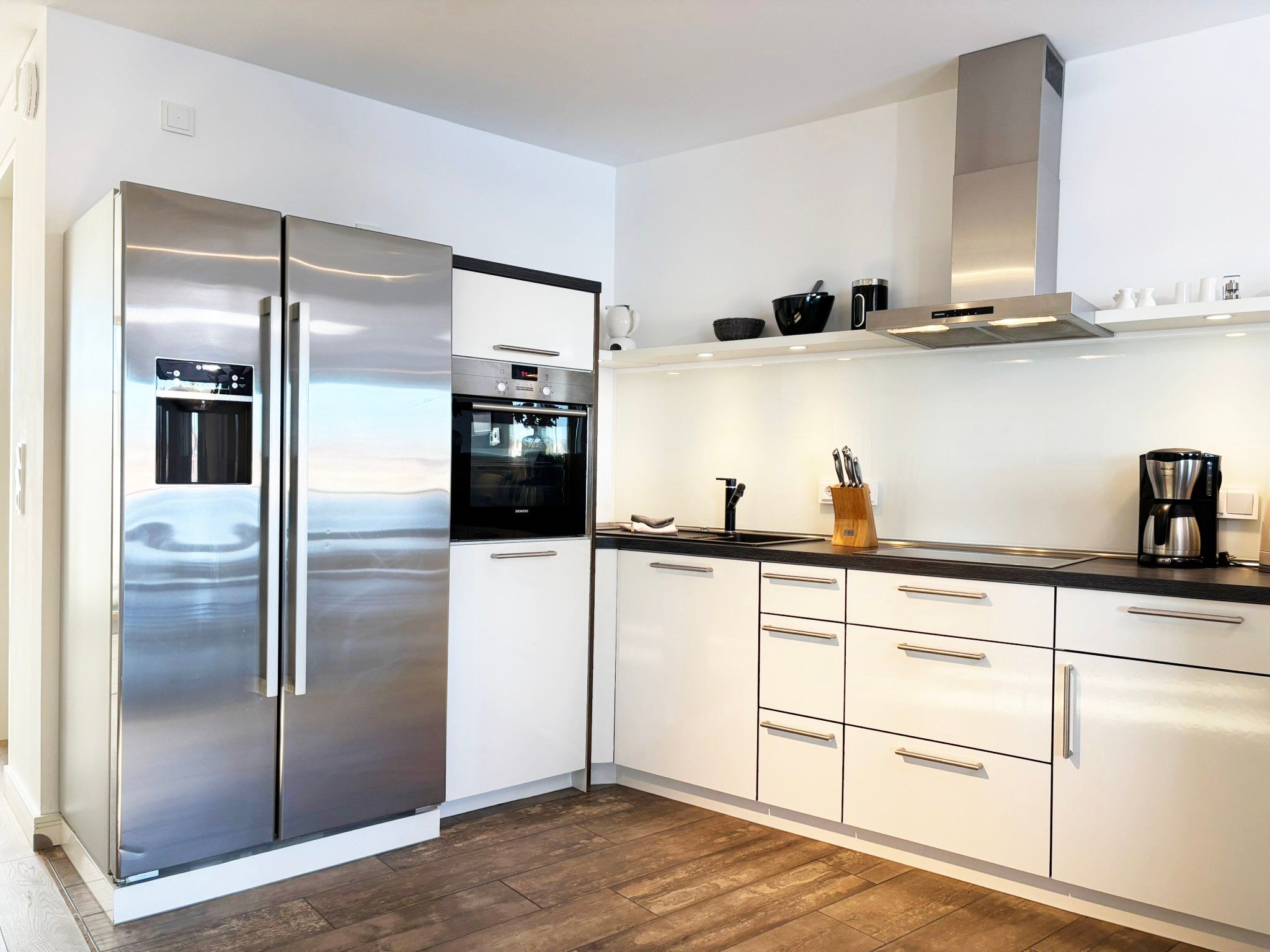 offene Küche: Mikrowelle, Cerankochfeld, Elektrobackofen, amerikanischer Kühlschrank mit IceCrusher und Gefrierfach, 1 Spülmaschiene, Filterkaffeemaschine, Wasserkocher, Toaster, Handrührgerät.
