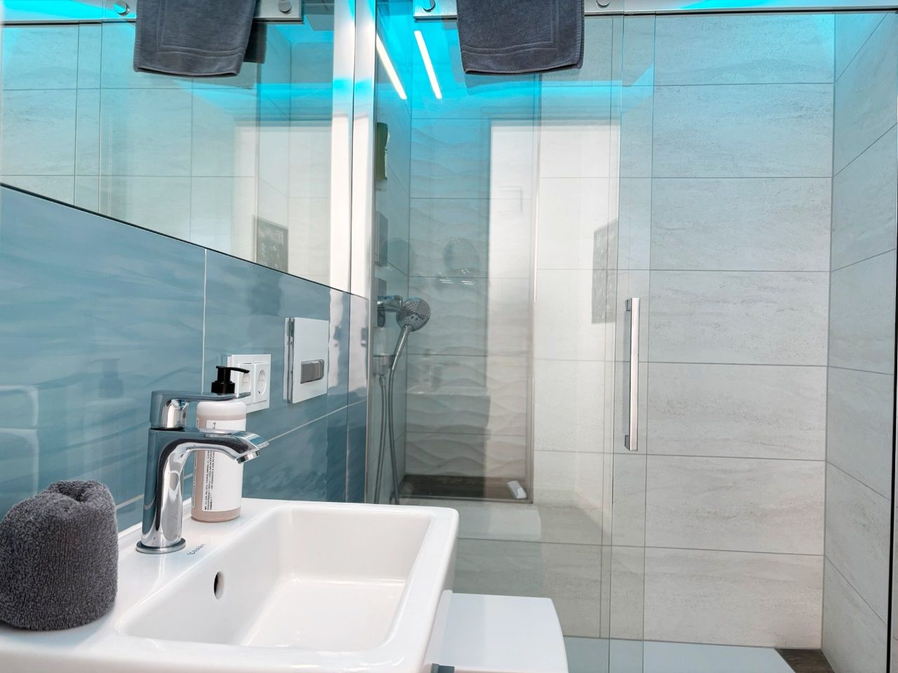 Zwei Badezimmer mit je einer ebenerdige Dusche, WC, Haartrockner, Spiegel und Waschbecken.