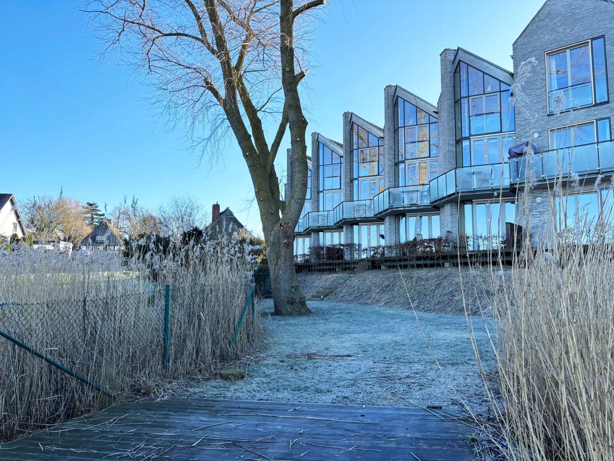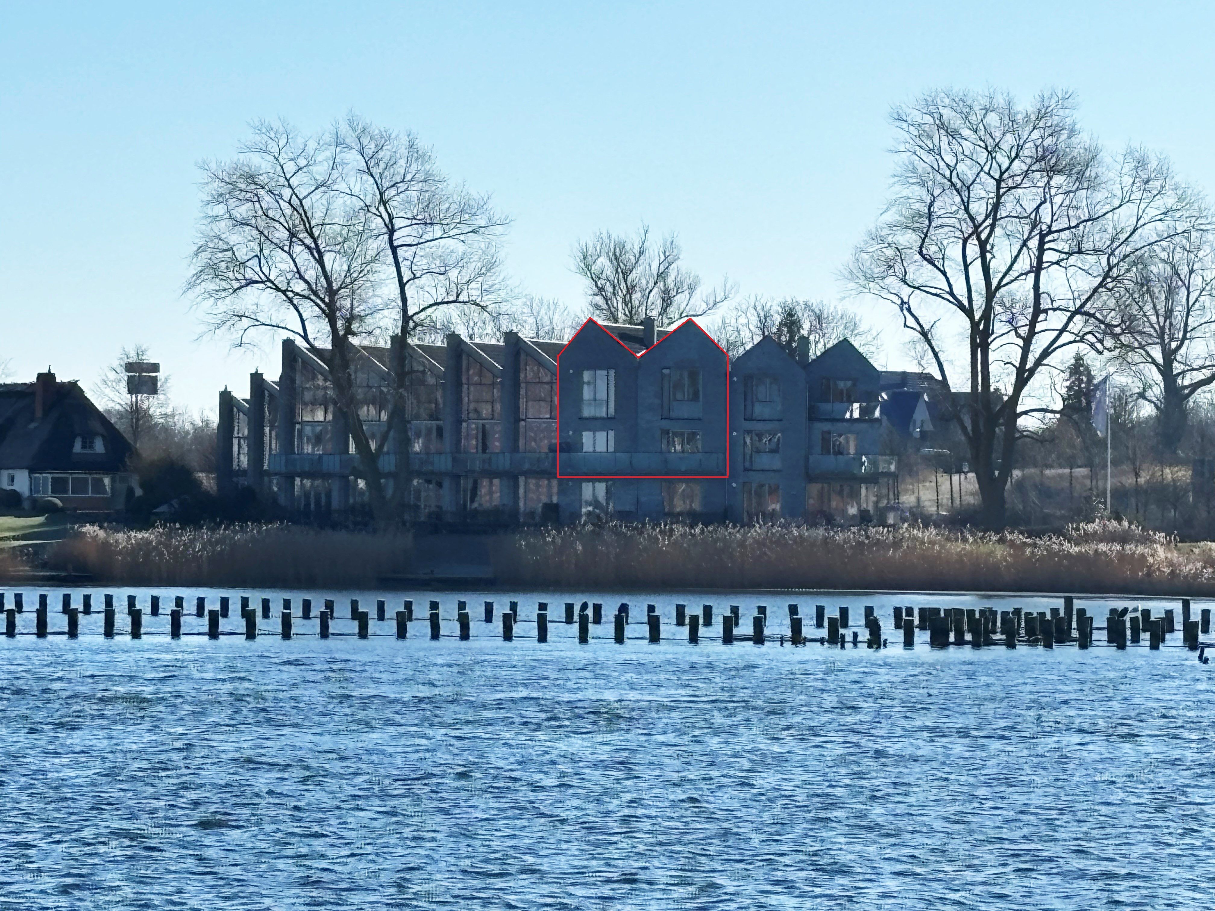 Außenbereich: möblierter Balkon mit Strandkorb, Garten zur Gemeinschaftsnutzung, Steg mit 2 Sonnenliegen und Sonnenschirm (Gemeinschaftsnutzung), Elektrogrill, Fahrradschuppen mit Ladestation für E-Bikes.