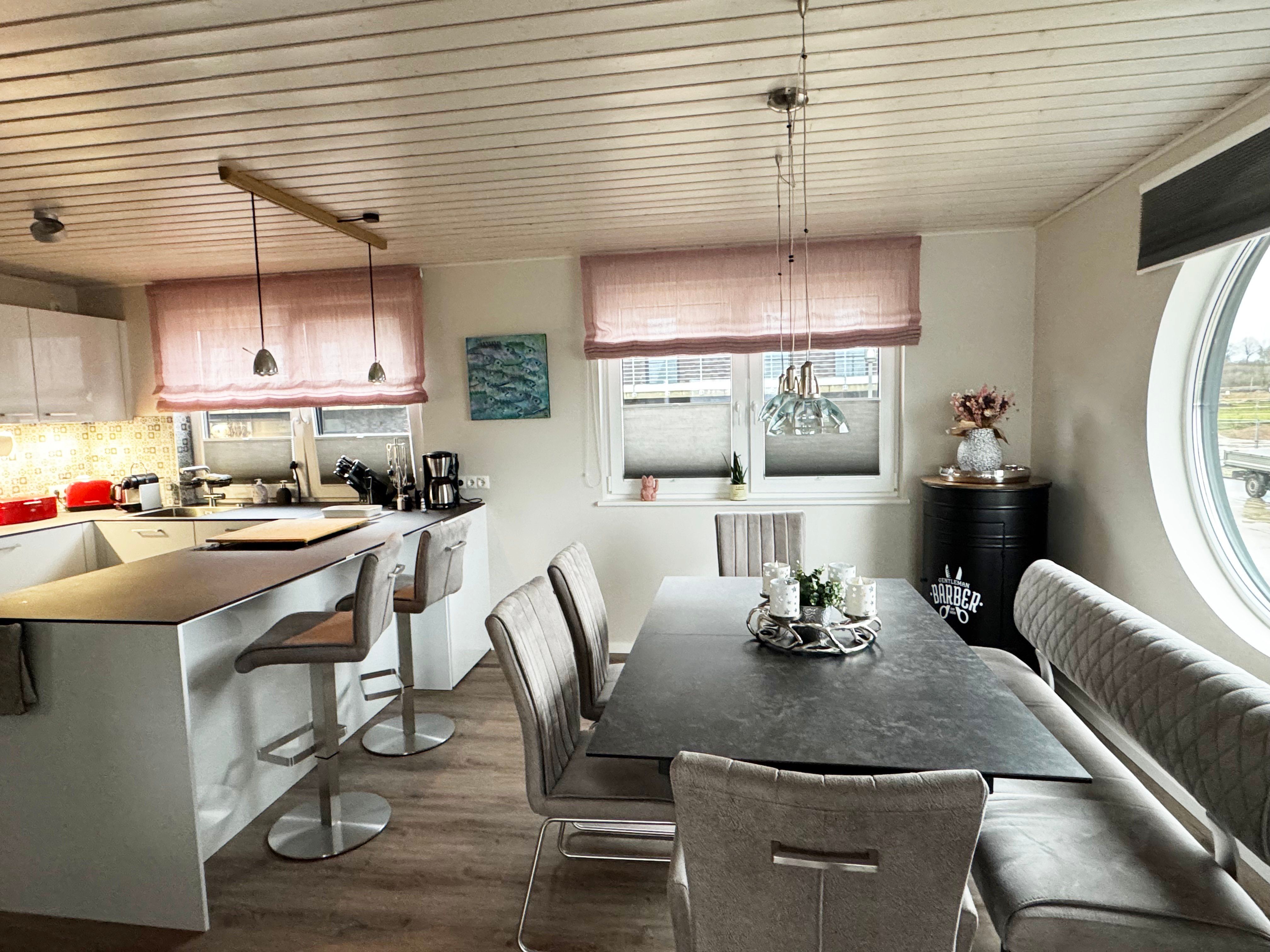 offene Küche: Mikrowelle, 4 Platten-Induktionskochfeld, Backofen, Kühlschrank, Gefrierfach, Spülmaschine, Filterkaffeemaschine und Kapselmaschine, Wasserkocher, Toaster, Handrührgerät.