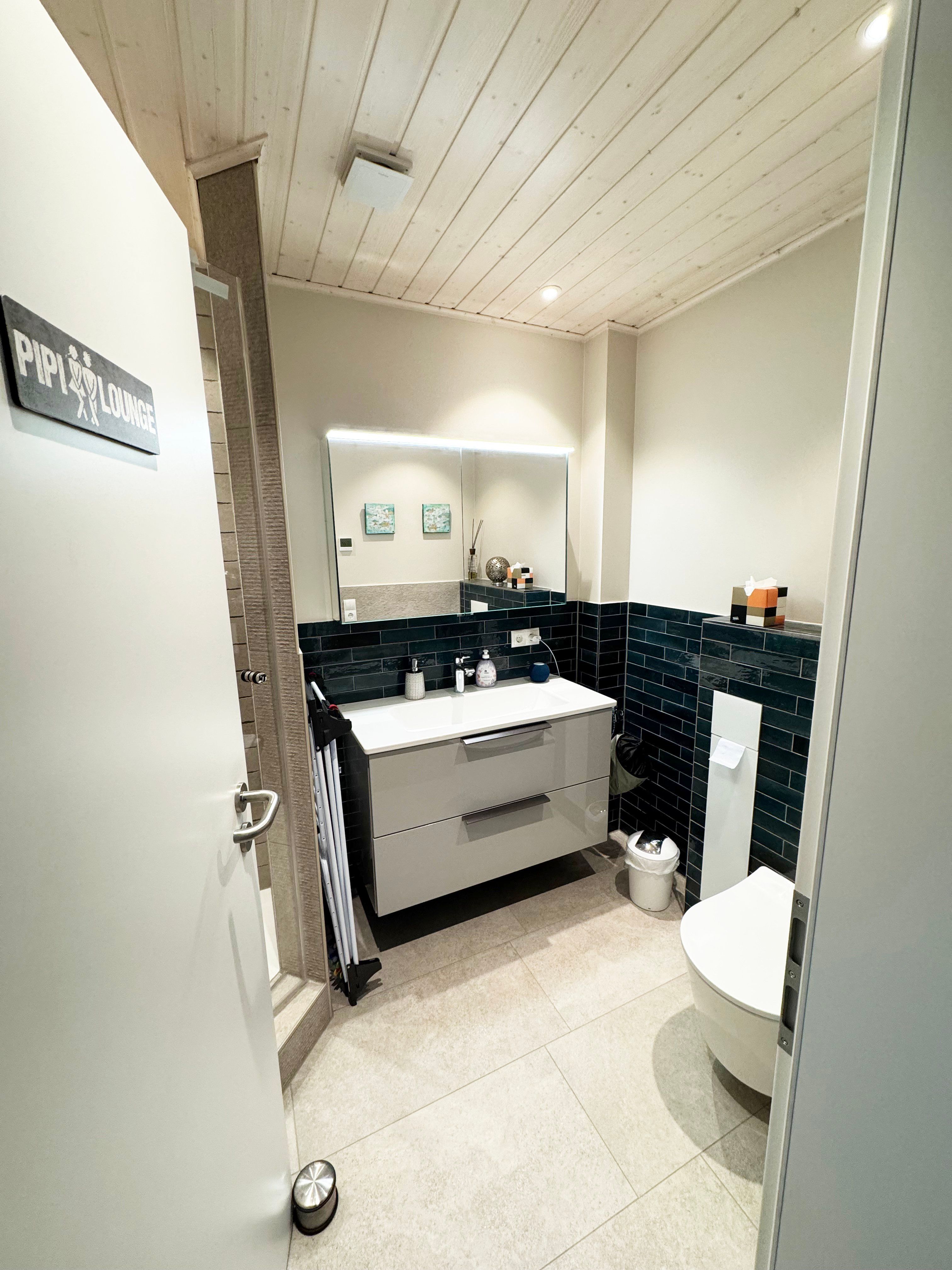 Badezimmer 2: Dusche, WC, Spiegel. Waschbecken.