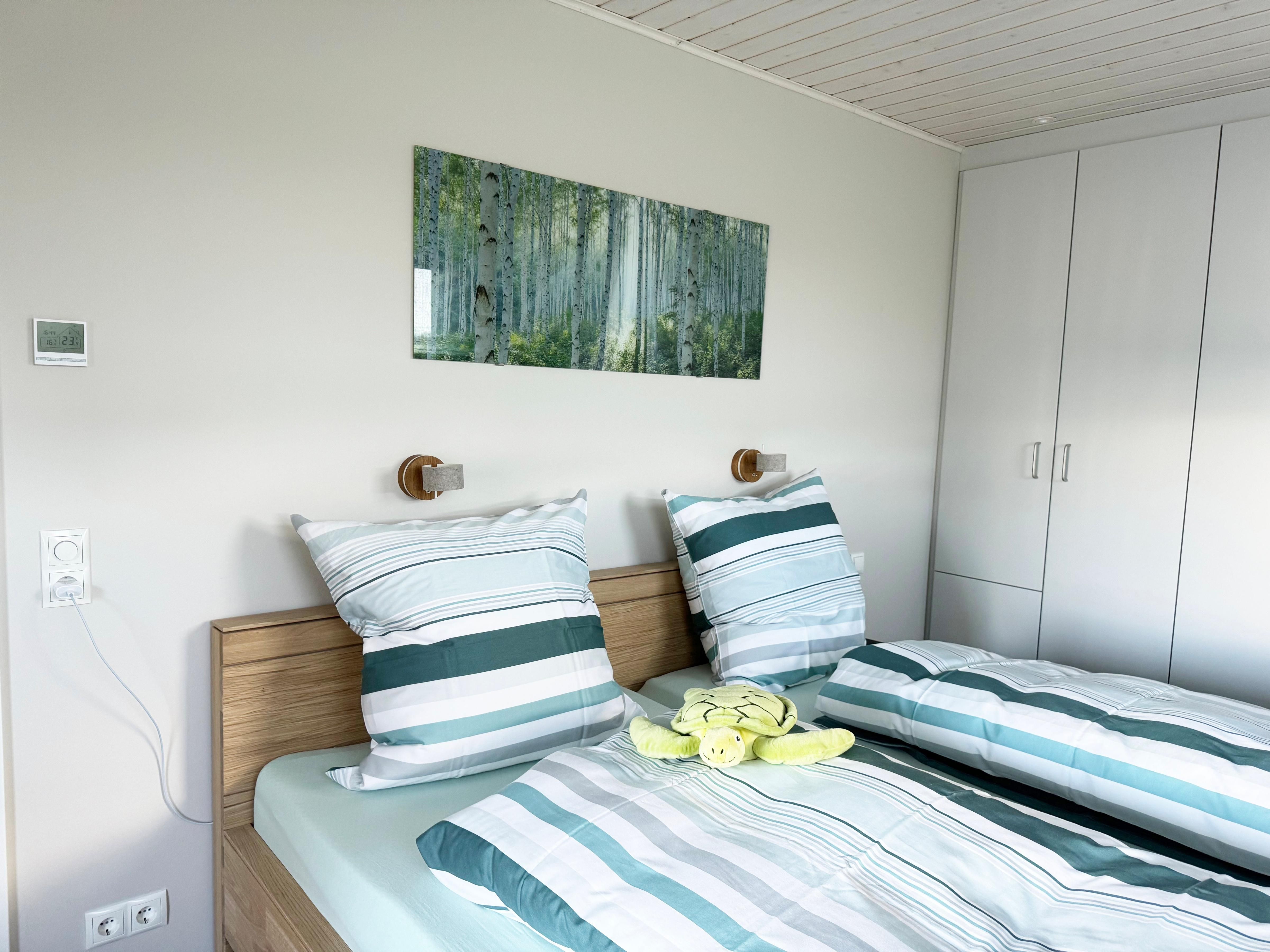 Schlafzimmer 2: Doppelbett 160x200 cm, getrennte Matratzen, offenes Fußende, Kleiderschrank, Verdunklungsmöglichkeit, TV.