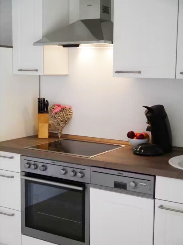 Die offene Küche ist vollständig ausgestattet und lädt zu unkomplizierten kulinarischen Momenten ein: Cerankochfeld, Backofen, Kühlschrank mit Gefrierfach, Geschirrspüler, Filterkaffeemaschine, Wasserkocher und Toaster stehen bereit – alles, was man braucht, ohne Überfluss.