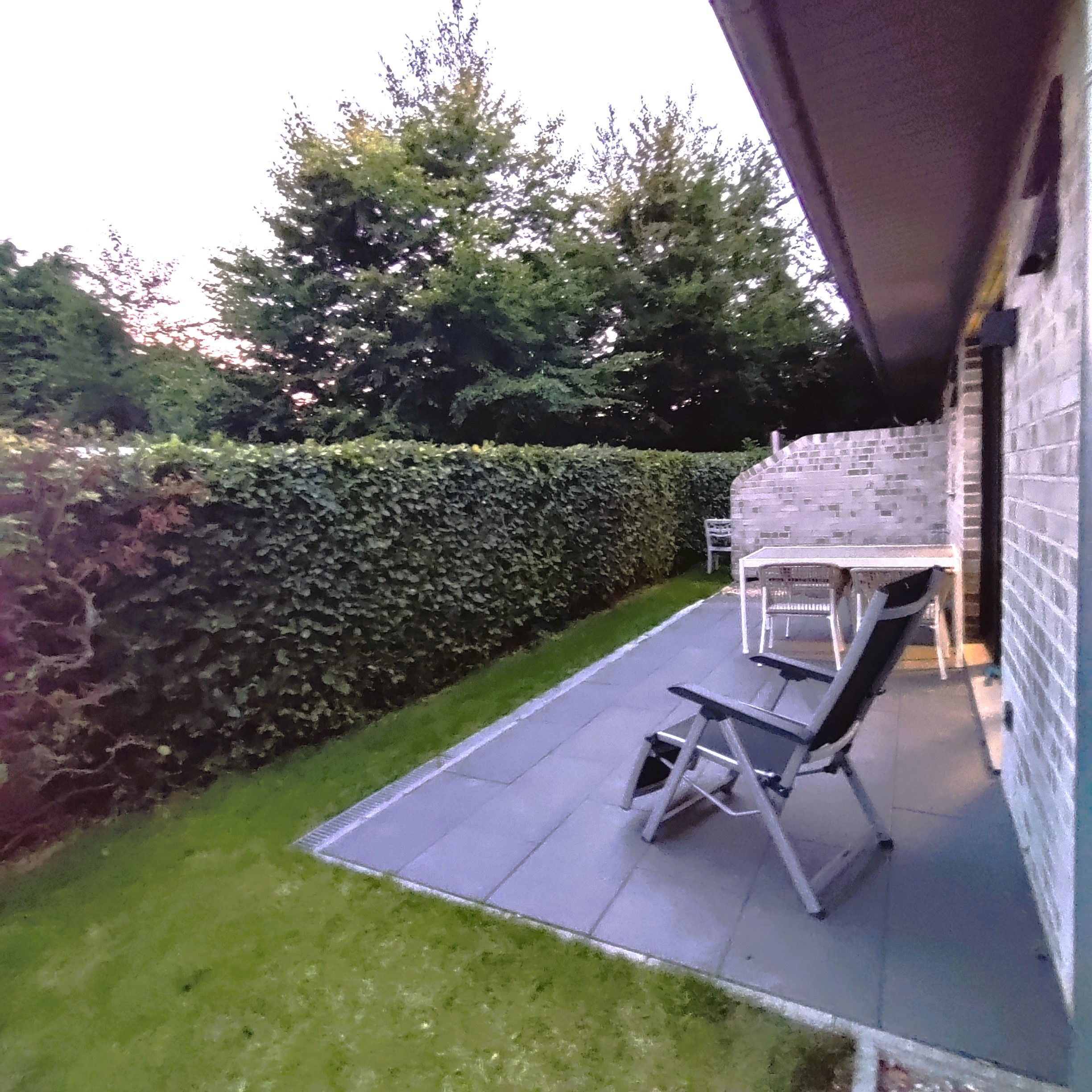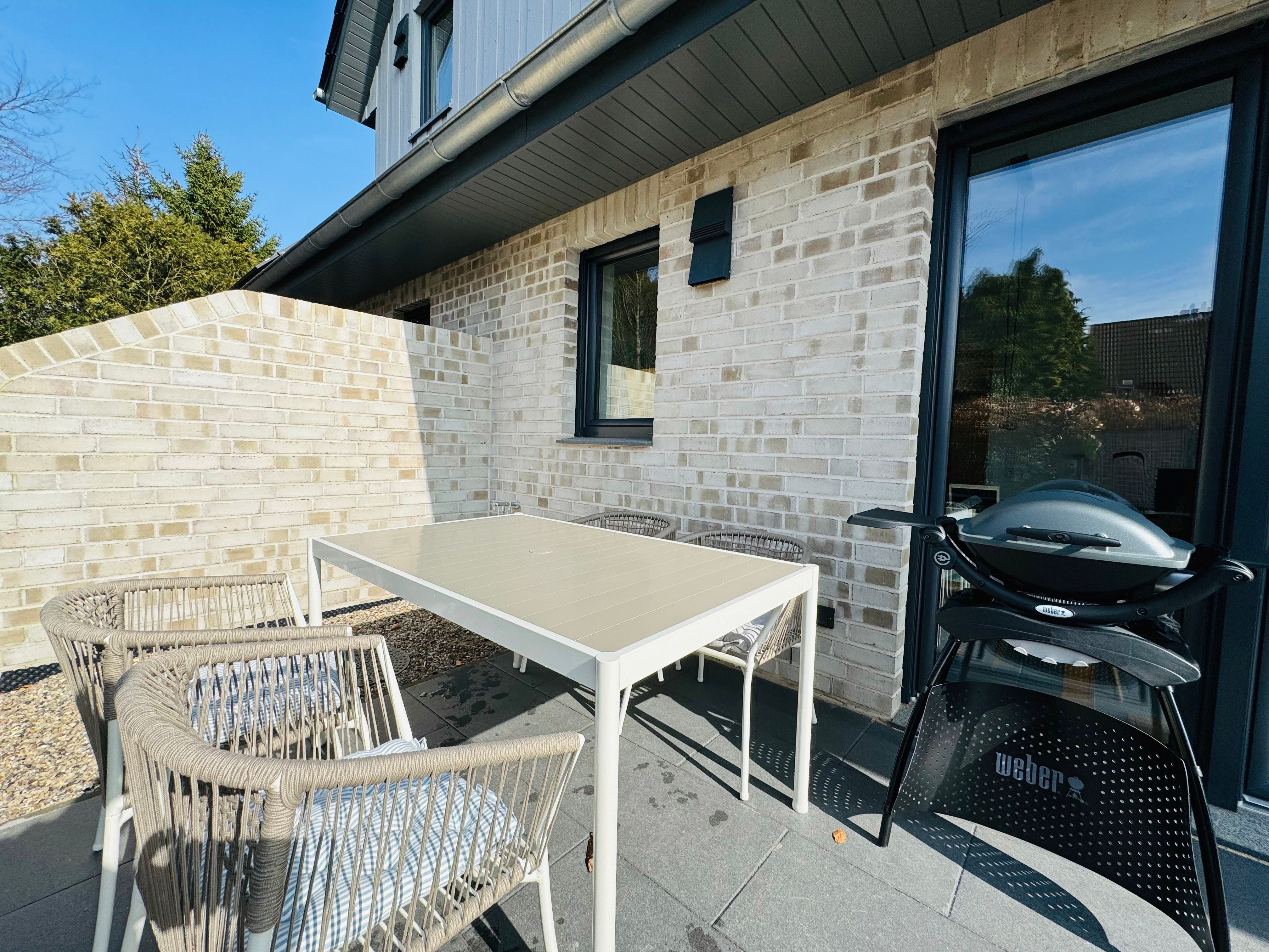 Terrasse mit Gartentisch, 2 Sonnenliegen und Elektrogrill.