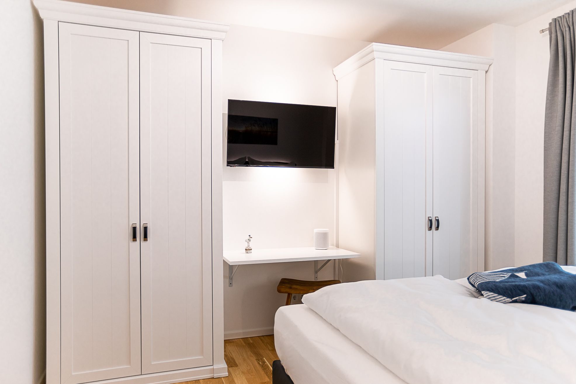Zwei Doppelschlafzimmer mit Boxspringbetten (180x200 cm und 160x200 cm), Kleiderschränken und Fernsehern (42 Zoll).