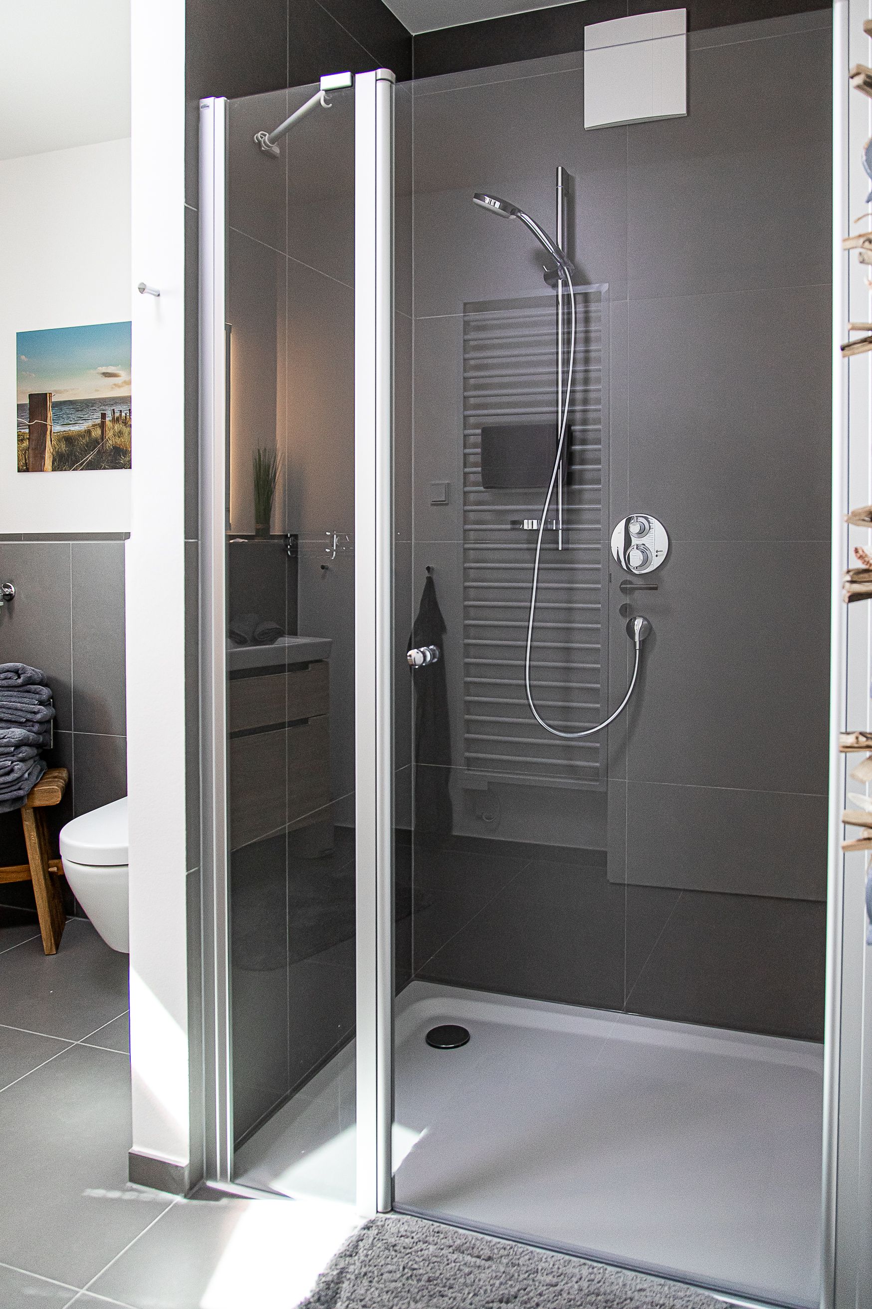 2. Tag mit etwas Übung doch zu meistern. Die großen, bodentiefen Fenstern ließen auch in diesem bedeckten Frühajhar genügend Licht in die Räume und die Fußbodenheizung heizte alle Räume angenehm warm. Die "ebenerdige" großzügige Dusche ermöglichte uns einen guten Start in den Tag.