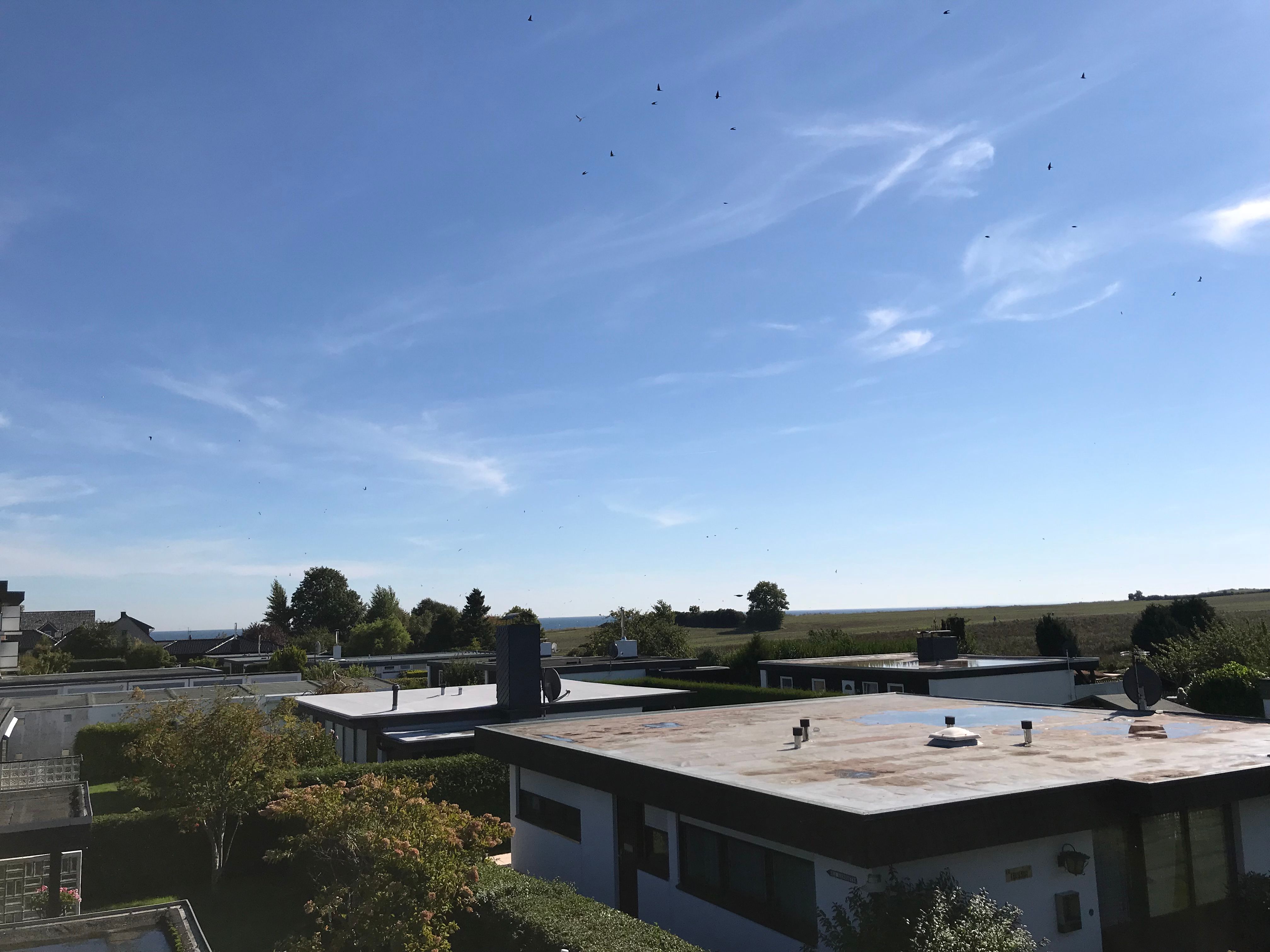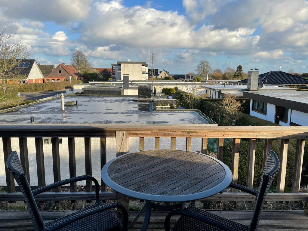 Balkon mit Gartenmöbeln und Ostseeblick.