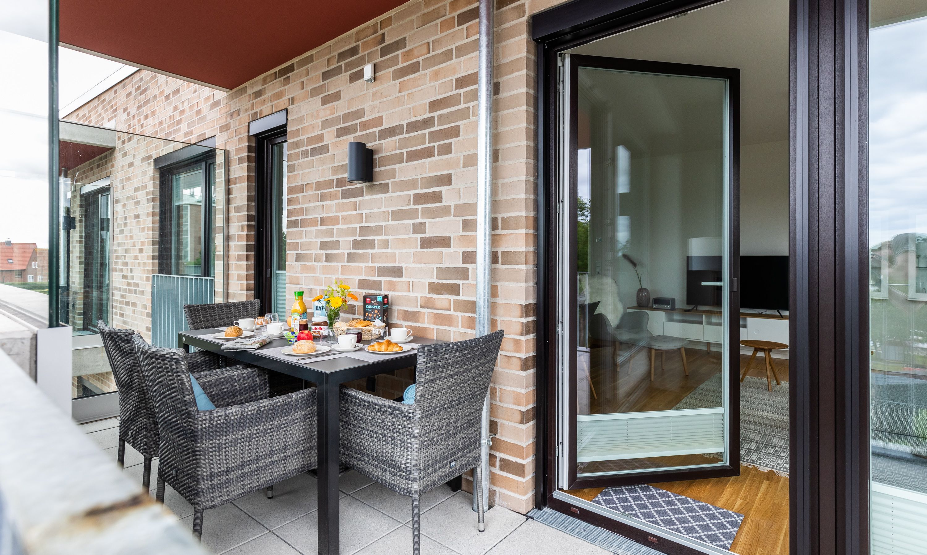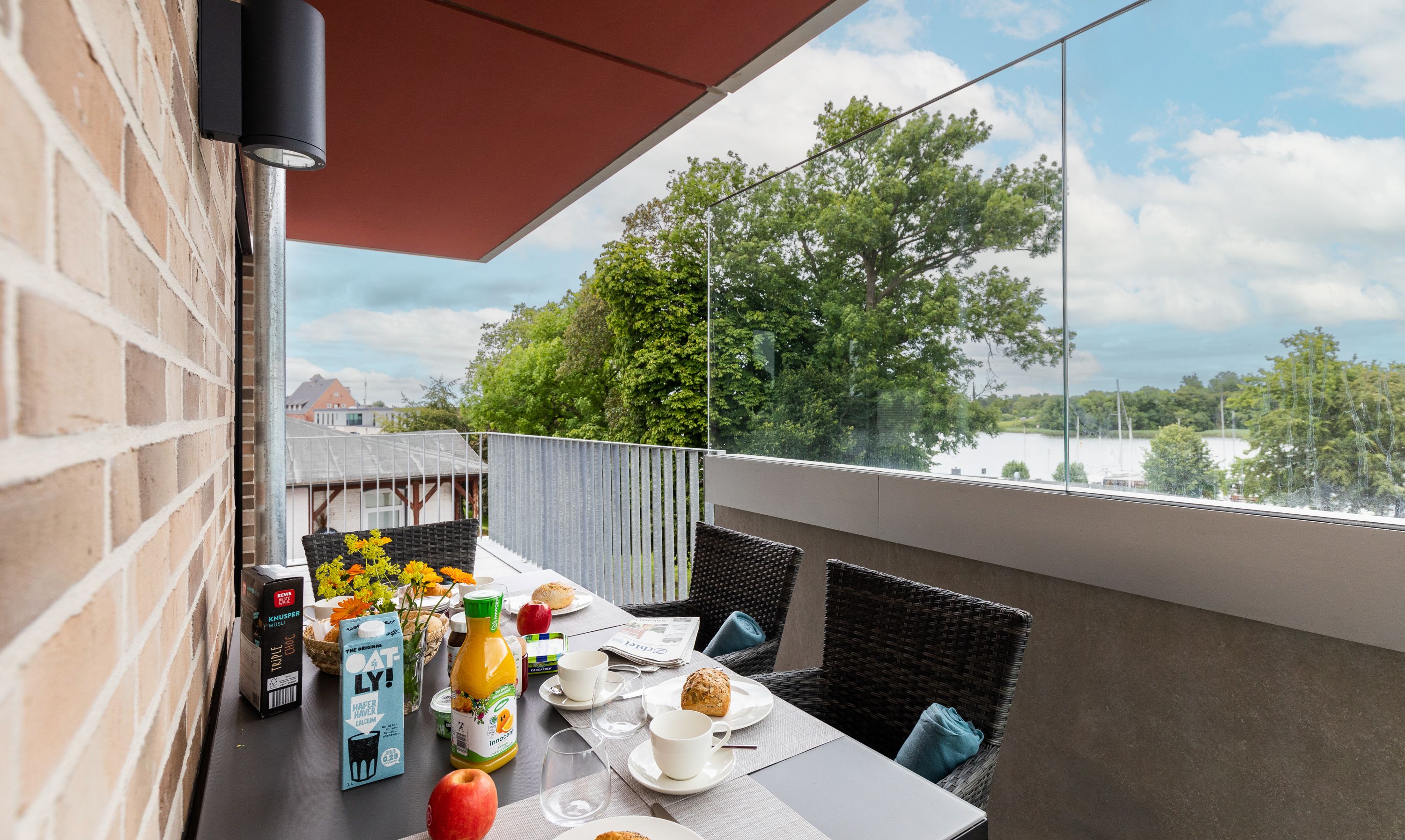 Großzügiger Balkon mit Gartenmöbeln, Elektrogrill und Blick auf die Schlei.