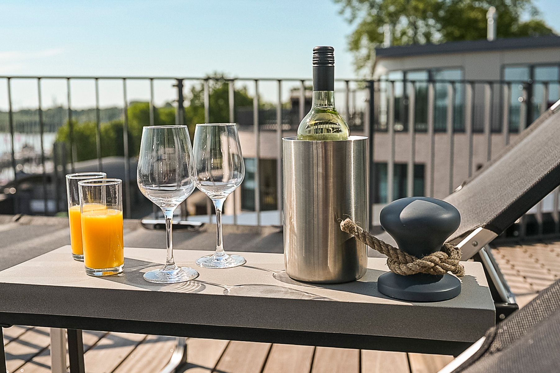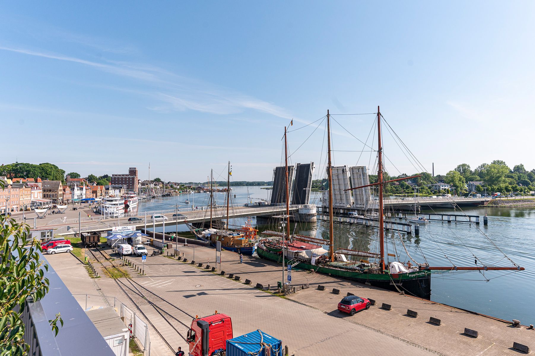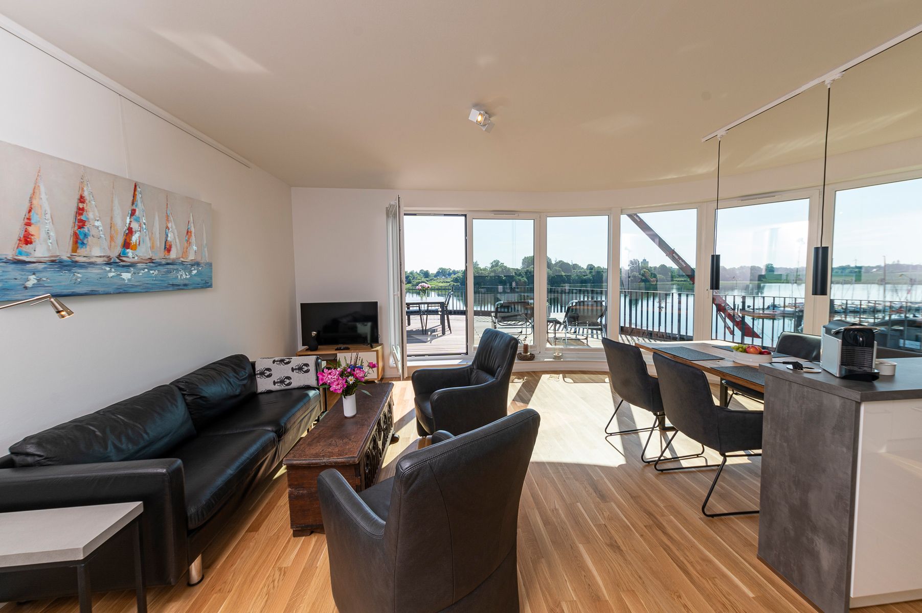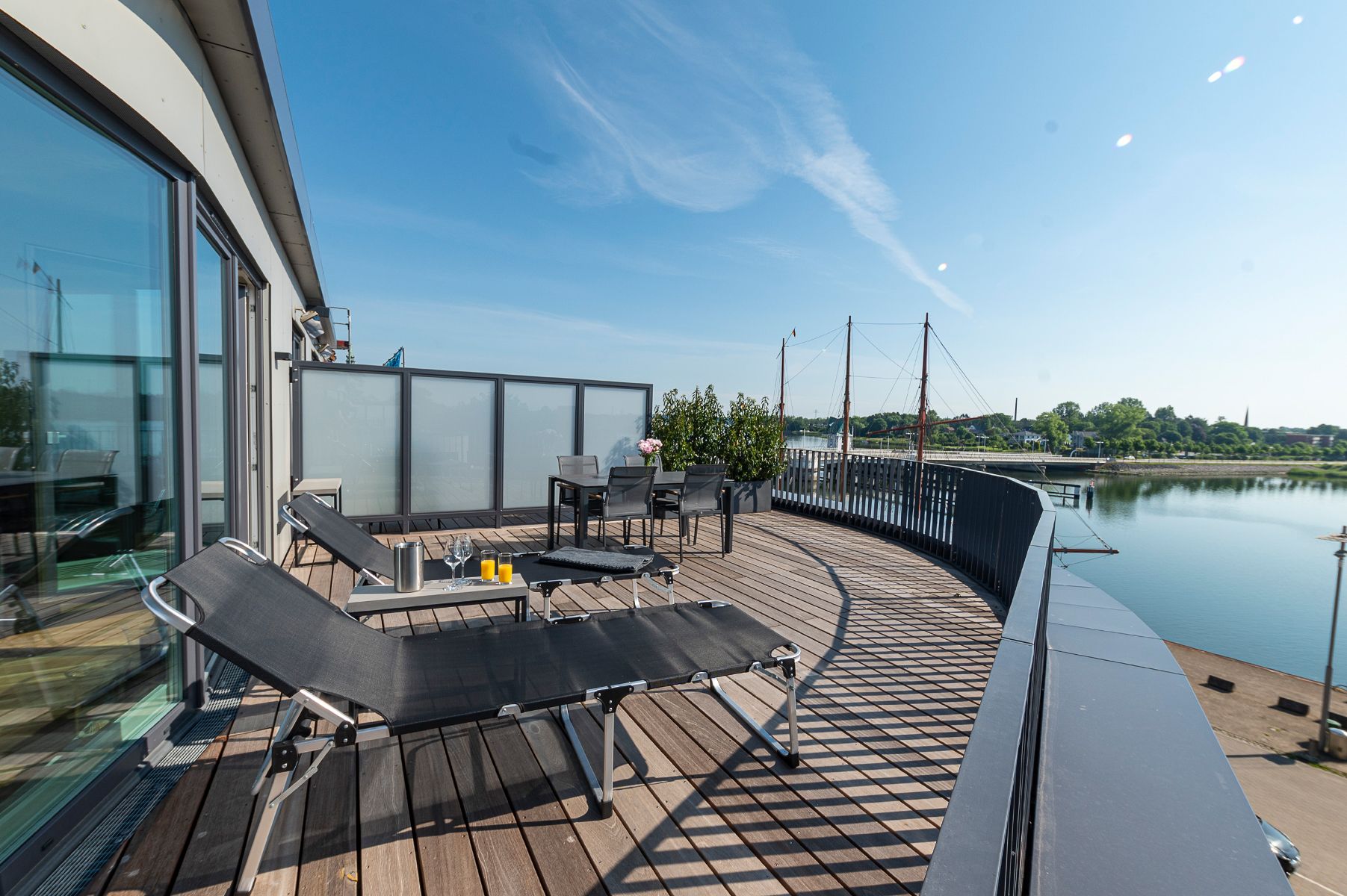 Highlight: Dachterrasse (Gartenmöbeln, Sonnenschirm, Strandkorb, Sonnenliegen und Elektrogrill) mit Blick auf die Schlei.