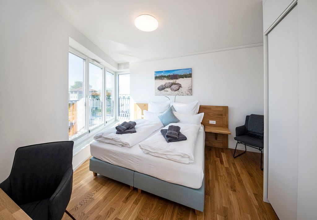 Ein Doppelschlafzimmer mit Boxspringbett (180x200 cm) Fernseher, Kleiderschrank und Verdunklungsmöglichkeit.