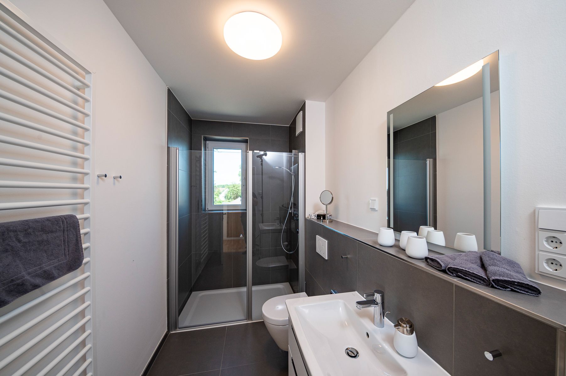 Tageslicht-Badezimmer mit ebenerdiger Dusche, Kosmetikspiegel und Fön.