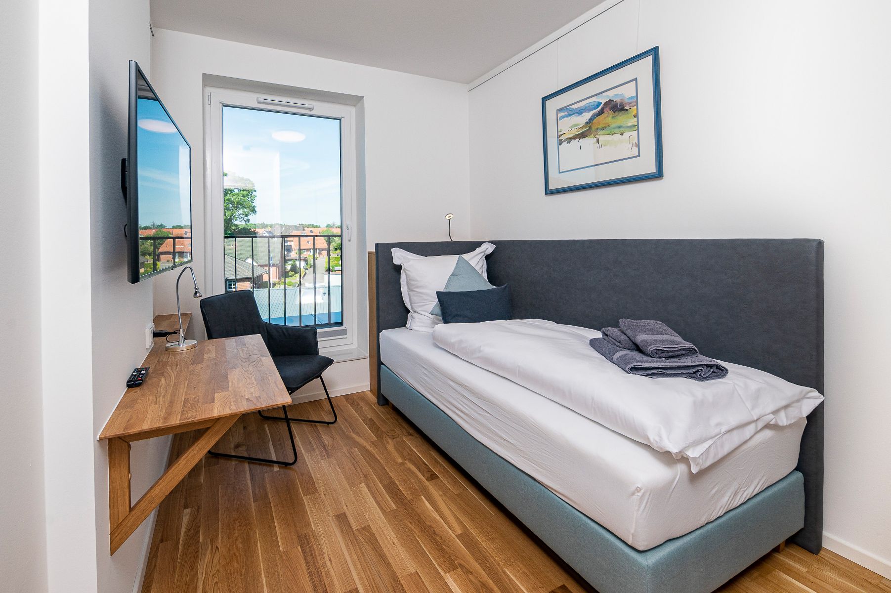 Ein Einzelbettschlafzimmer mit Boxspringbett (90x200 cm) Fernseher, Kleiderschrank und Verdunklungsmöglichkeit.