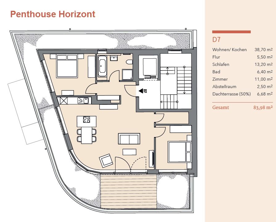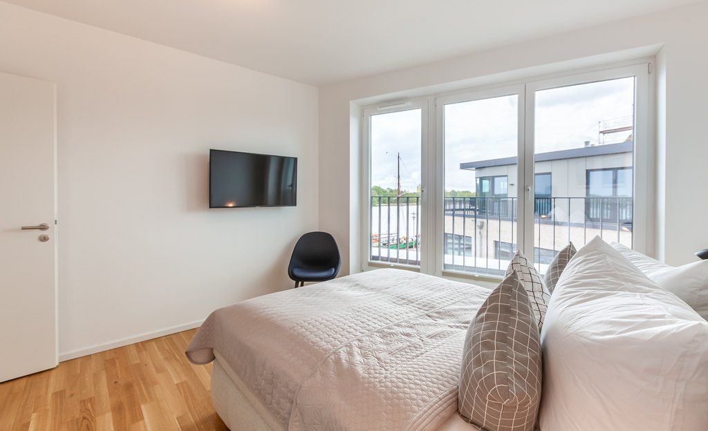 Hoch oben, ganz für dich. Dieses Penthouse für bis zu 4 Personen nimmt die gesamte oberste Etage ein. Du genießt volle Privatsphäre und eine große Dachterrasse, die nur dir gehört. Die breiten Fensterfronten holen die Schlei direkt ins Wohnzimmer. Du sitzt am Tisch, trinkst Kaffee, Tee oder Wein und schaust auf das Wasser. Die Klappbrücke bewegt sich, Segler ziehen vorbei, das Licht verändert sich über den Tag. Ein Ort zum Durchatmen. Ein Ort zum Bleiben.