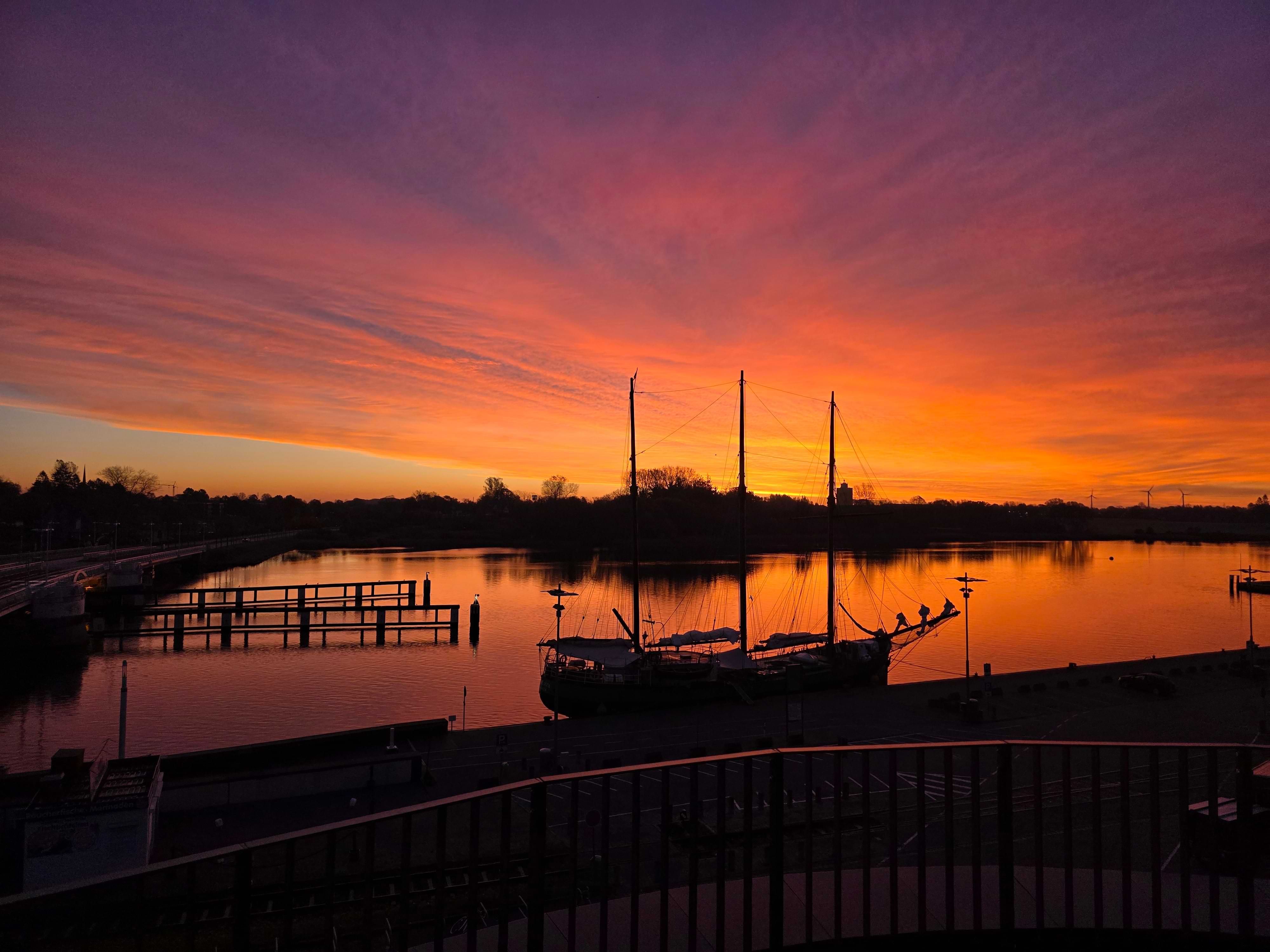 Ankommen, tief durchatmen und dann einfach nur schauen. Dieser Blick. Auf die Schlei, auf das klare Wasser am Hafen, auf die Masten der Schiffe. Ein Panorama, das sofort Ruhe bringt. Die weite Wasserfläche wirkt offen und klar. Die Silhouetten der Bäume und der historische Hafen schaffen eine besondere Stimmung.