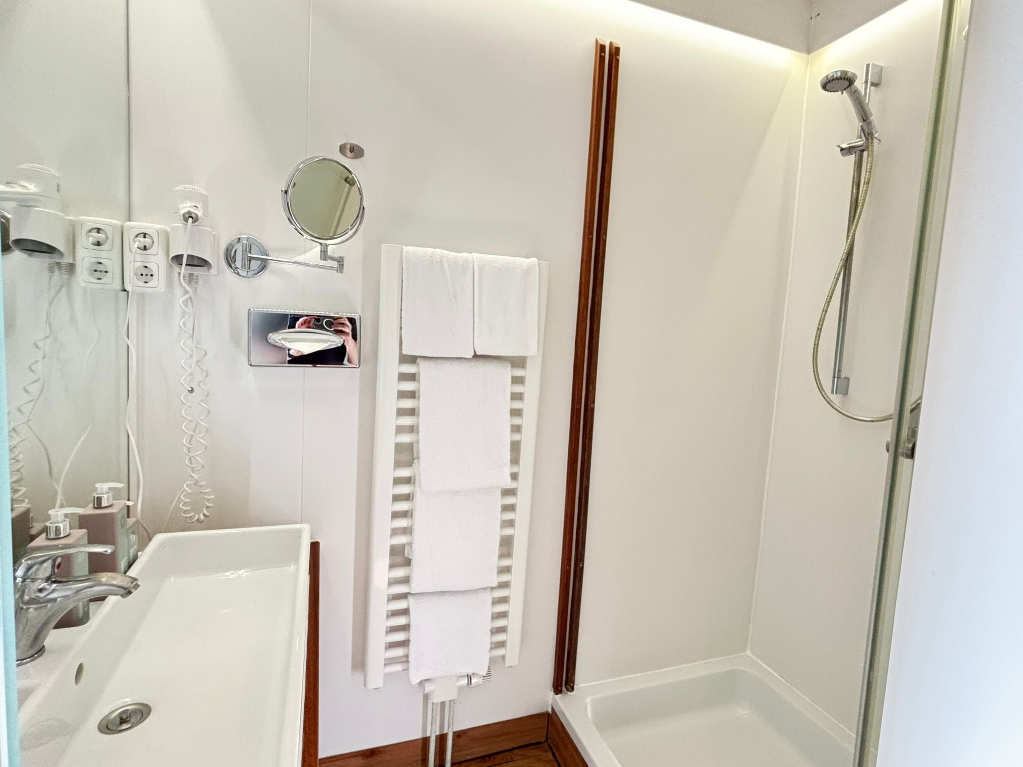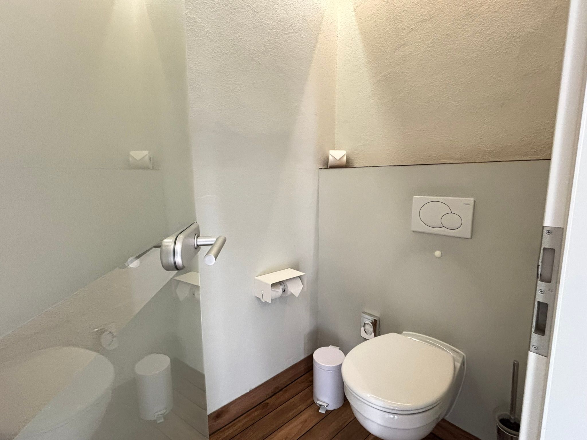 Badezimmer in zwei separate Räume aufgeteilt: Raum 1: WC; Raum 2: ebenerdige Dusche, Haartrockner, Spiegel, Kosmetikspiegel und Waschbecken.