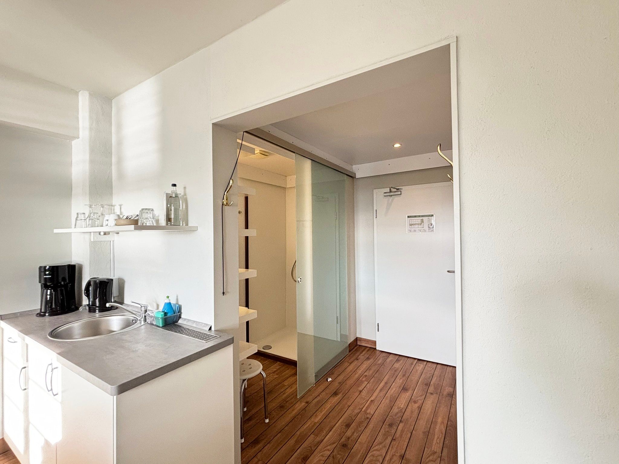 Pantryküche für die Zubereitung von kleinen Mahlzeiten oder einem Frühstück: zwei Kochplatten, ein kleiner Kühlschrank, eine Filterkaffeemaschine, Wasserkocher, Toaster und Eierkocher.