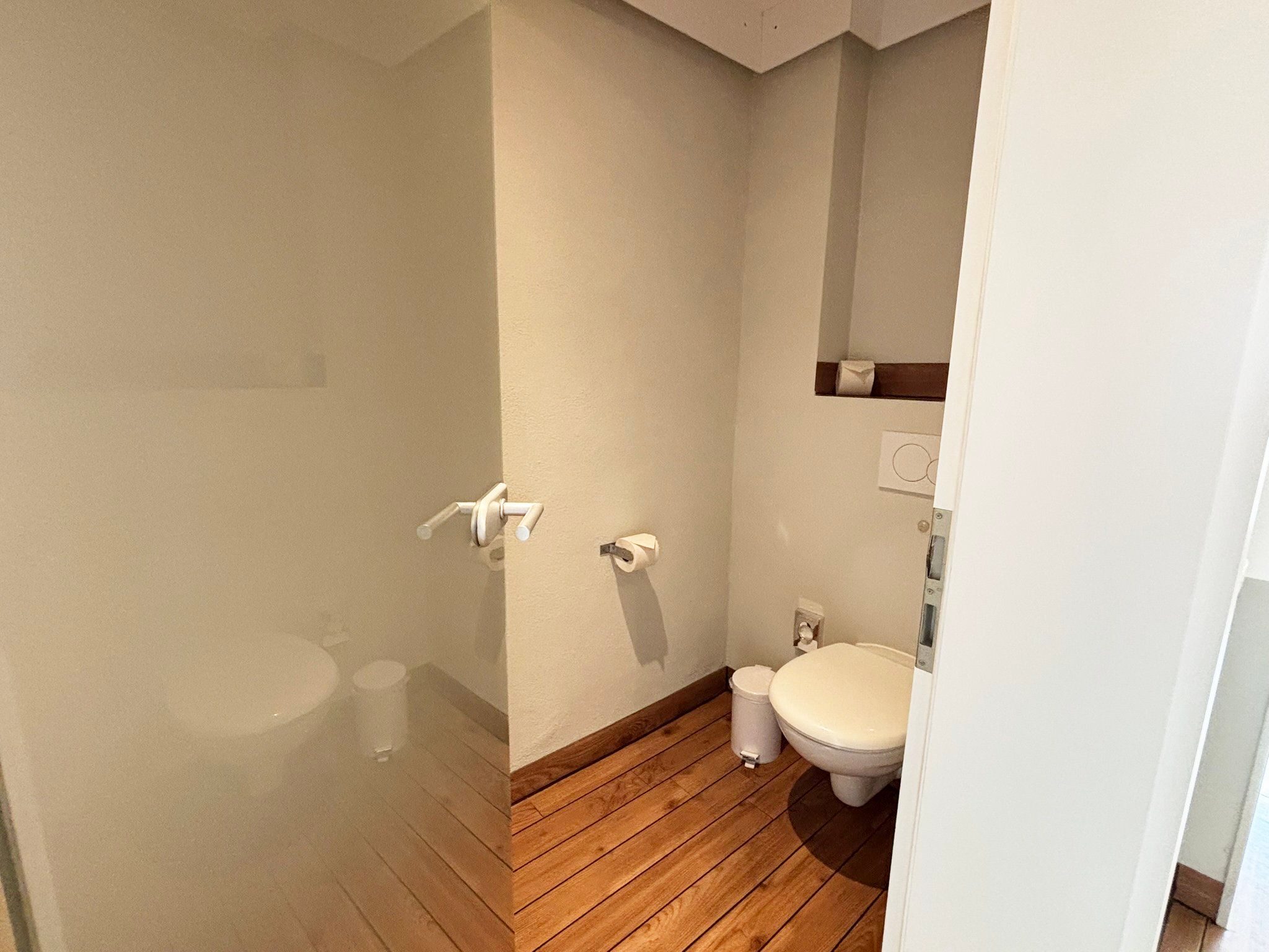 Badezimmer: funktional in zwei separate Räume aufgeteilt. Raum 1: WC. Raum 2: Dusche, Haartrockner, Spiegel, Kosmetikspiegel und Waschbecken.