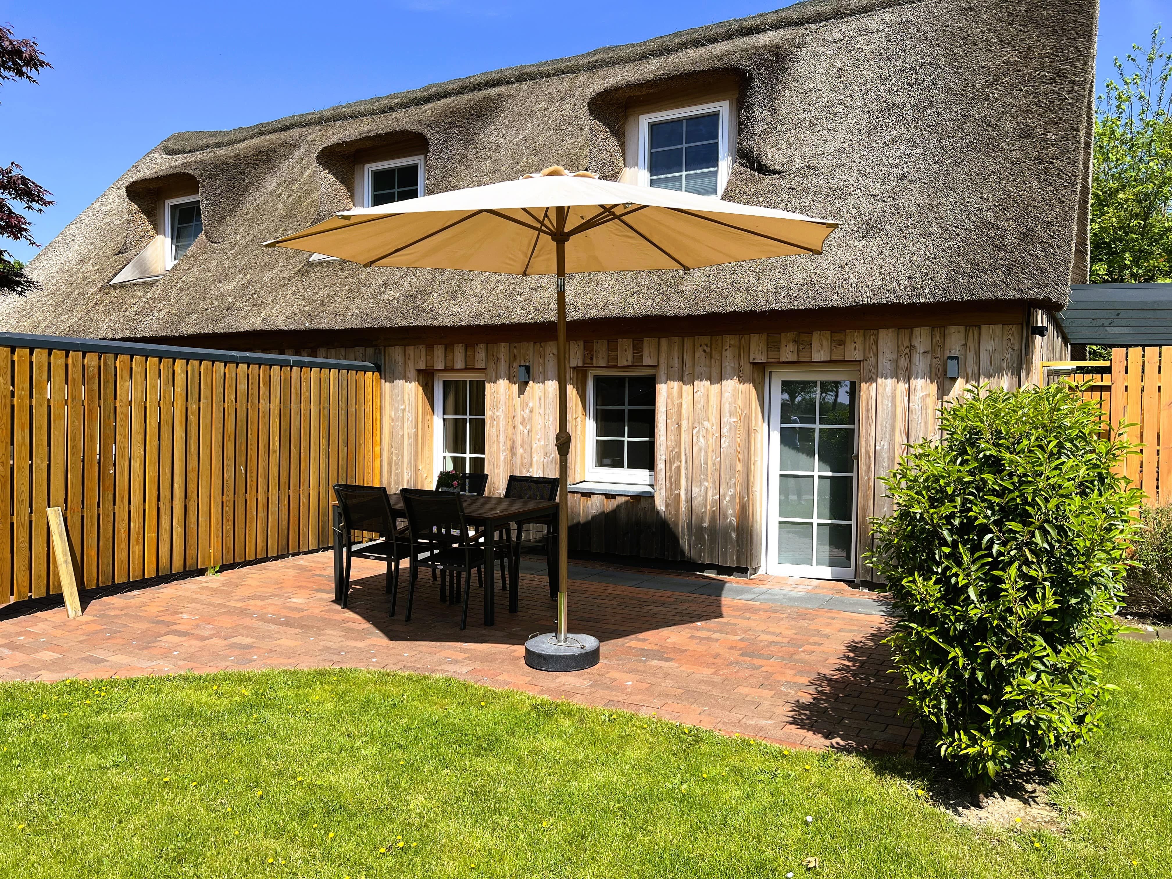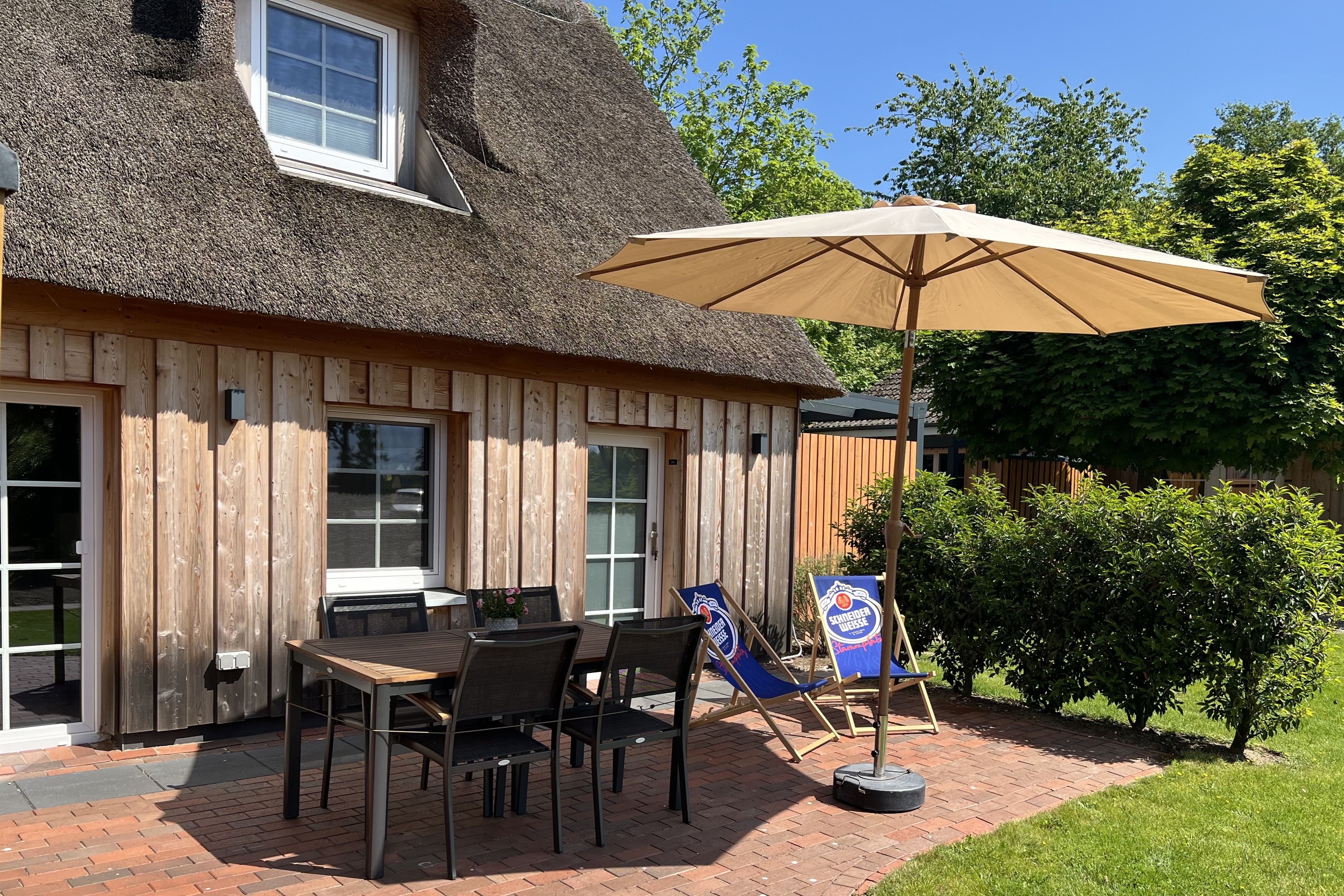 Außen: Gartensauna (Fasssauna) zur Gemeinschaftsnutzung mit Außendusche -Nutzung Sauna: 8,00 € pro Stunde (Münzautomat), Gemeinschaftsgarten, Liegewiese, eigene Terrasse mit Gartenmöbeln, Sonnenschirm und Windschutz. Das Grillen ist aufgrund des Reetdaches nicht gestattet.