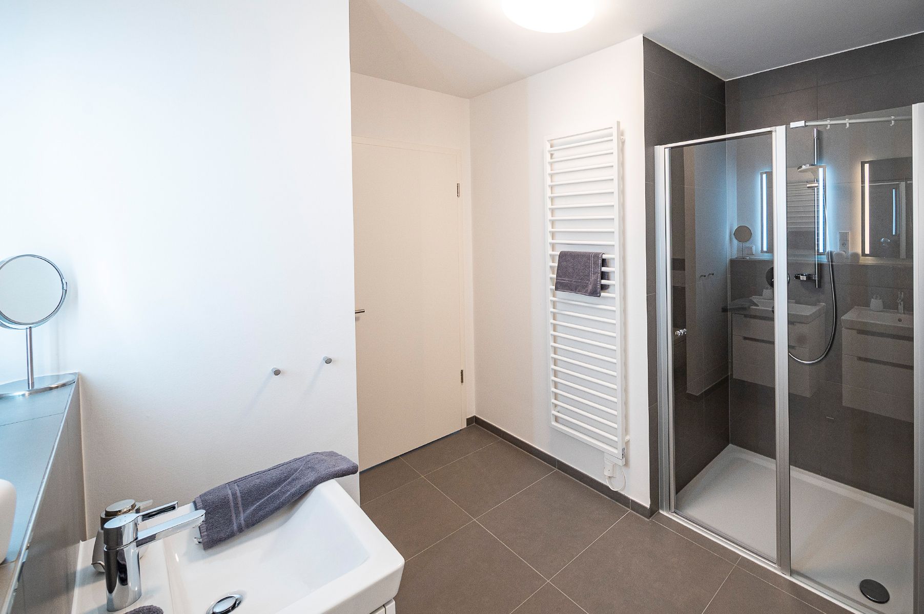 Tageslicht-Badezimmer mit ebenerdiger Dusche, zwei Waschbecken, Kosmetikspiegel und Fön.