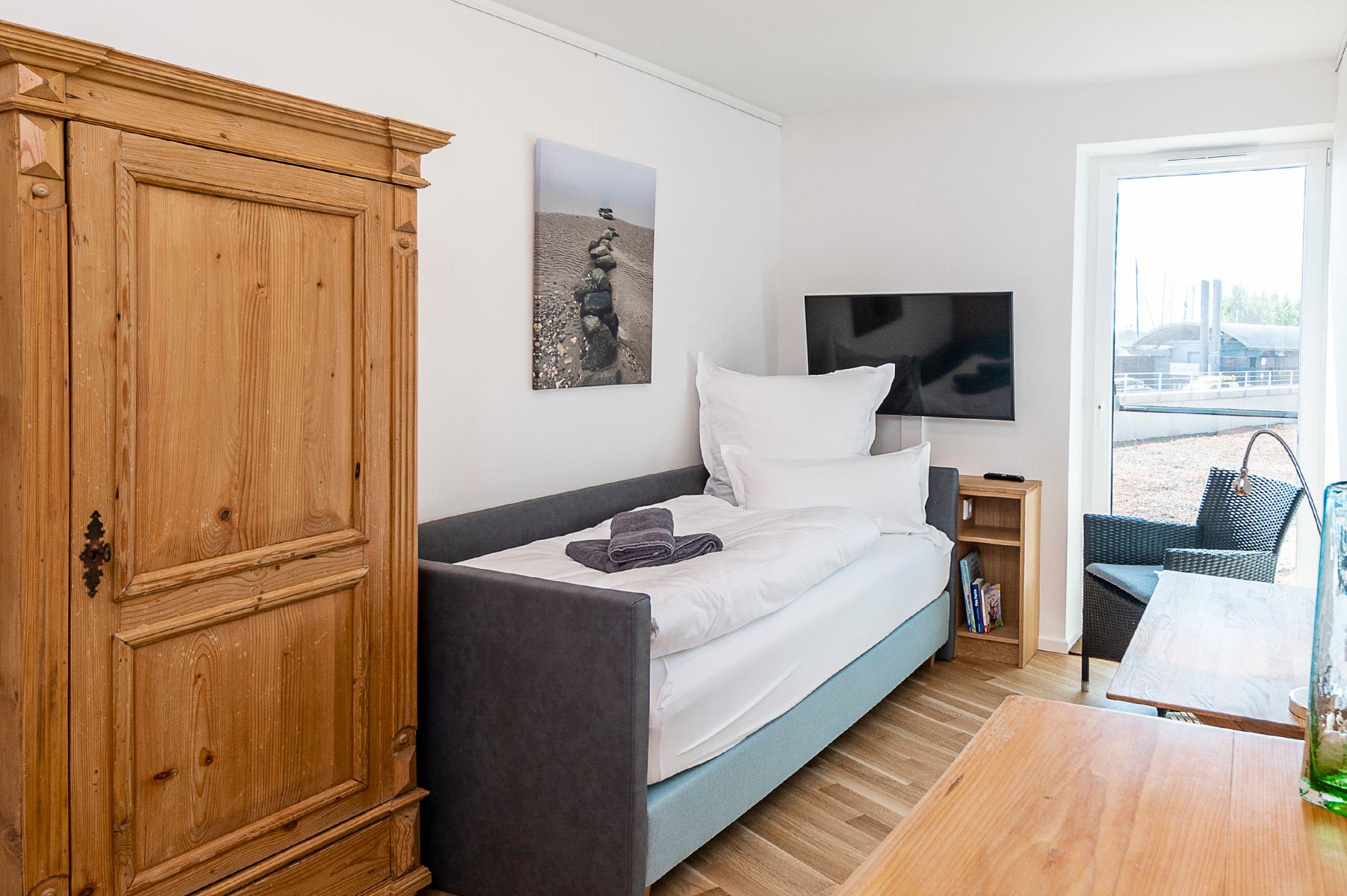 Ein Einzelbettschlafzimmer mit Boxspringbett (90x200 cm) Fernseher, Kleiderschrank und Verdunklungsmöglichkeit.