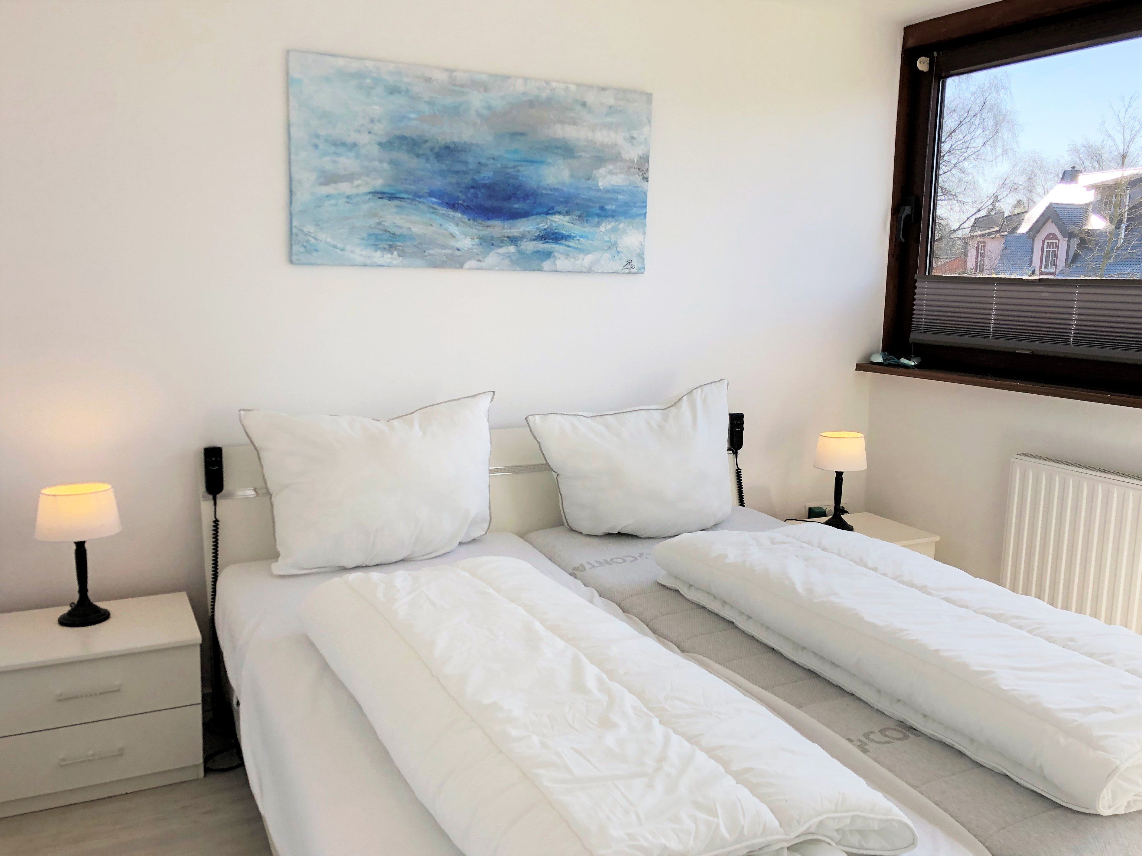 Schlafzimmer mit einem Doppelbett (2x 90x200 cm) und elektrisch verstellbarem Lattenrost.