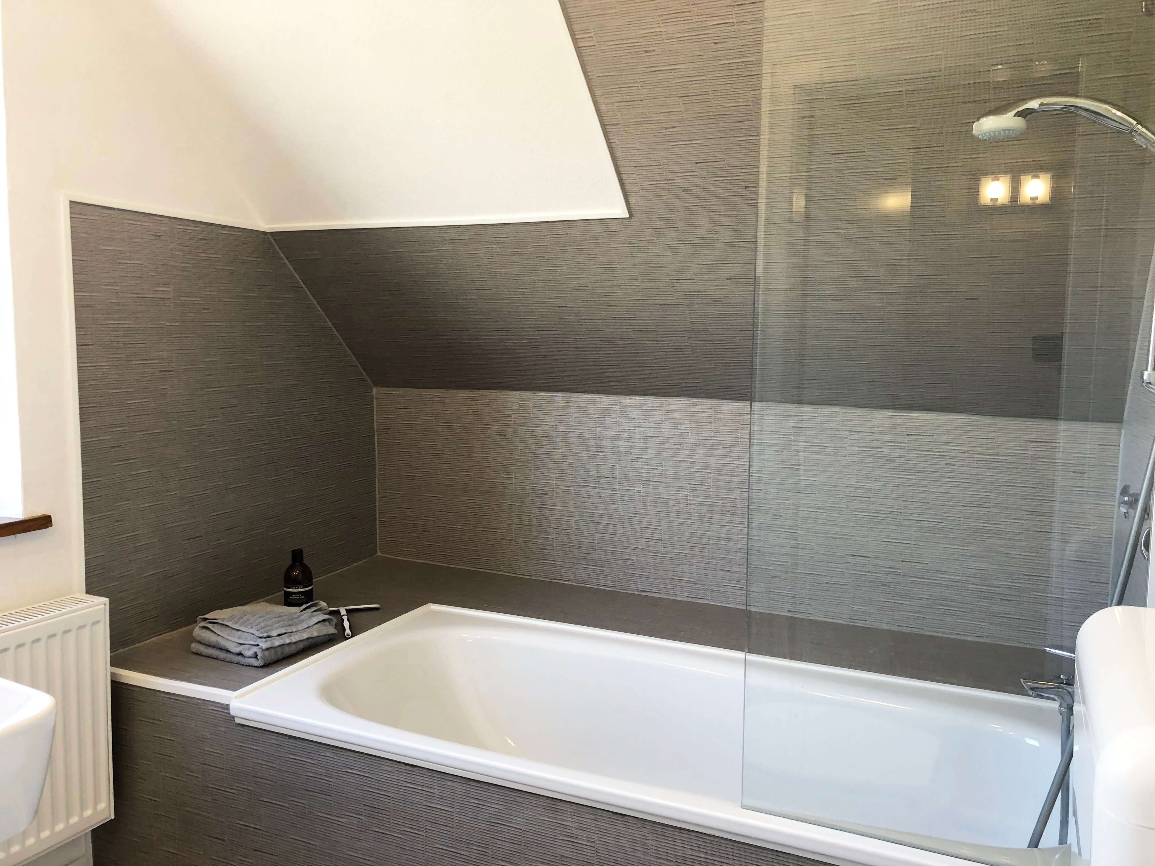 Vorsorglich weisen wir daraufhin, dass sich die Badewanne in einer Dachschräge befindet. Damit auch große Menschen bequem duschen können, ist ein extra Sitz vorhanden.