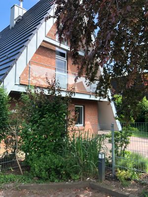Außenbereich: Terrasse und zwei Balkone, Garten, 2 Sonnenliegen, Gartenmöbel, Gasgrill, Sonnenschirm, Teich (eingezäunt), Fahrradständer, , Spielplatz in der Nähe.