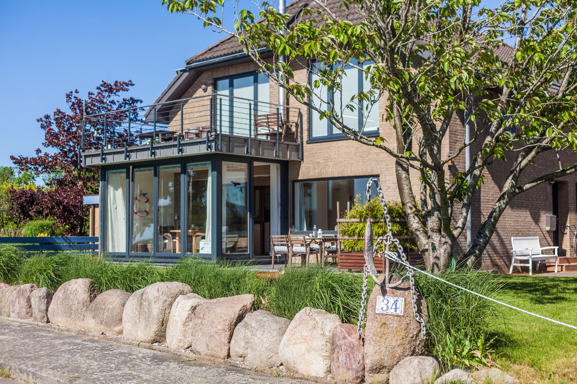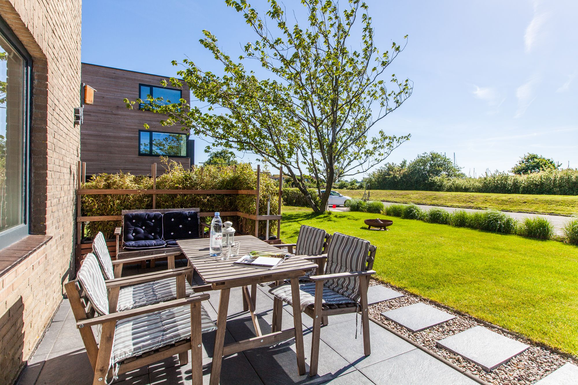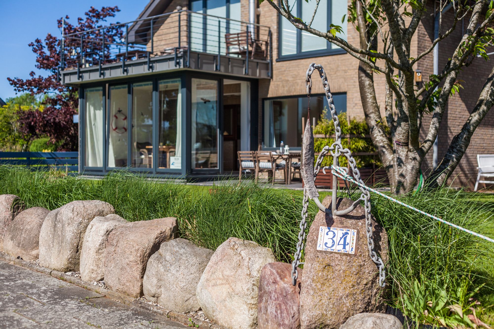Gartenbenutzung. Sonnenliegen und Sitzplatz mit Blick auf die Schlei.