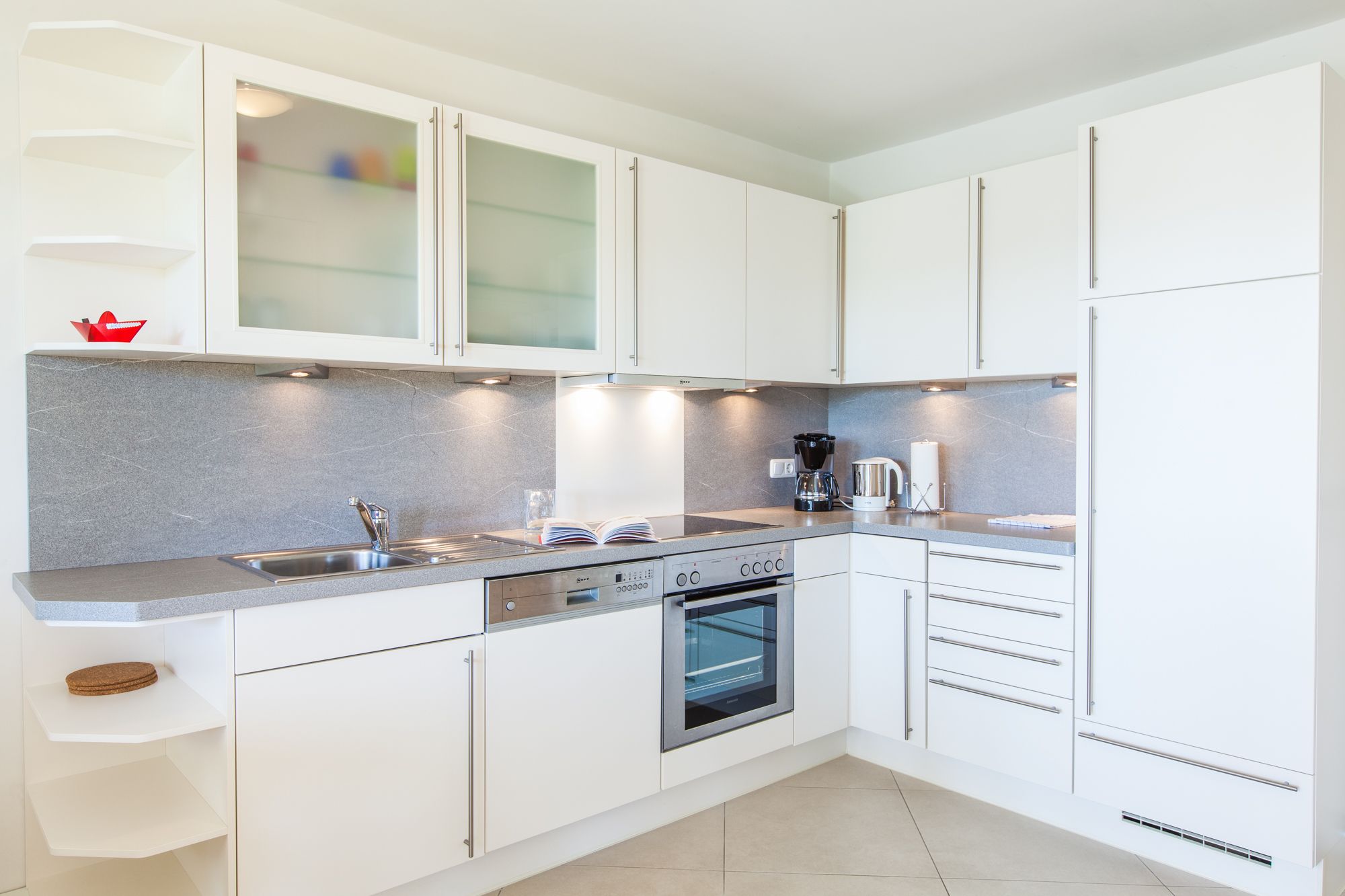 Großzügige Küche mit Ceranfeld, Backofen, Kaffeemaschine, Toaster, Wasserkocher, Kühlschrank mit 3-Sterne-Gefrierfach.