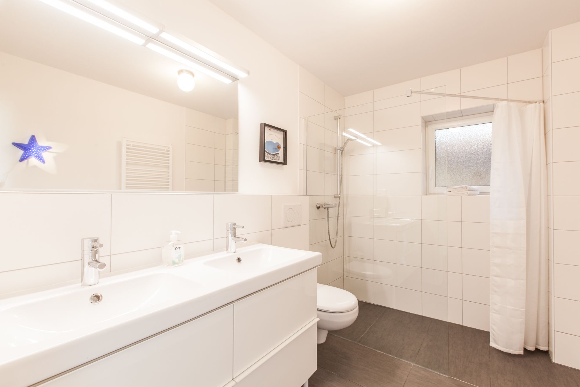 Badezimmer mit Dusche und Doppelwaschbecken.
