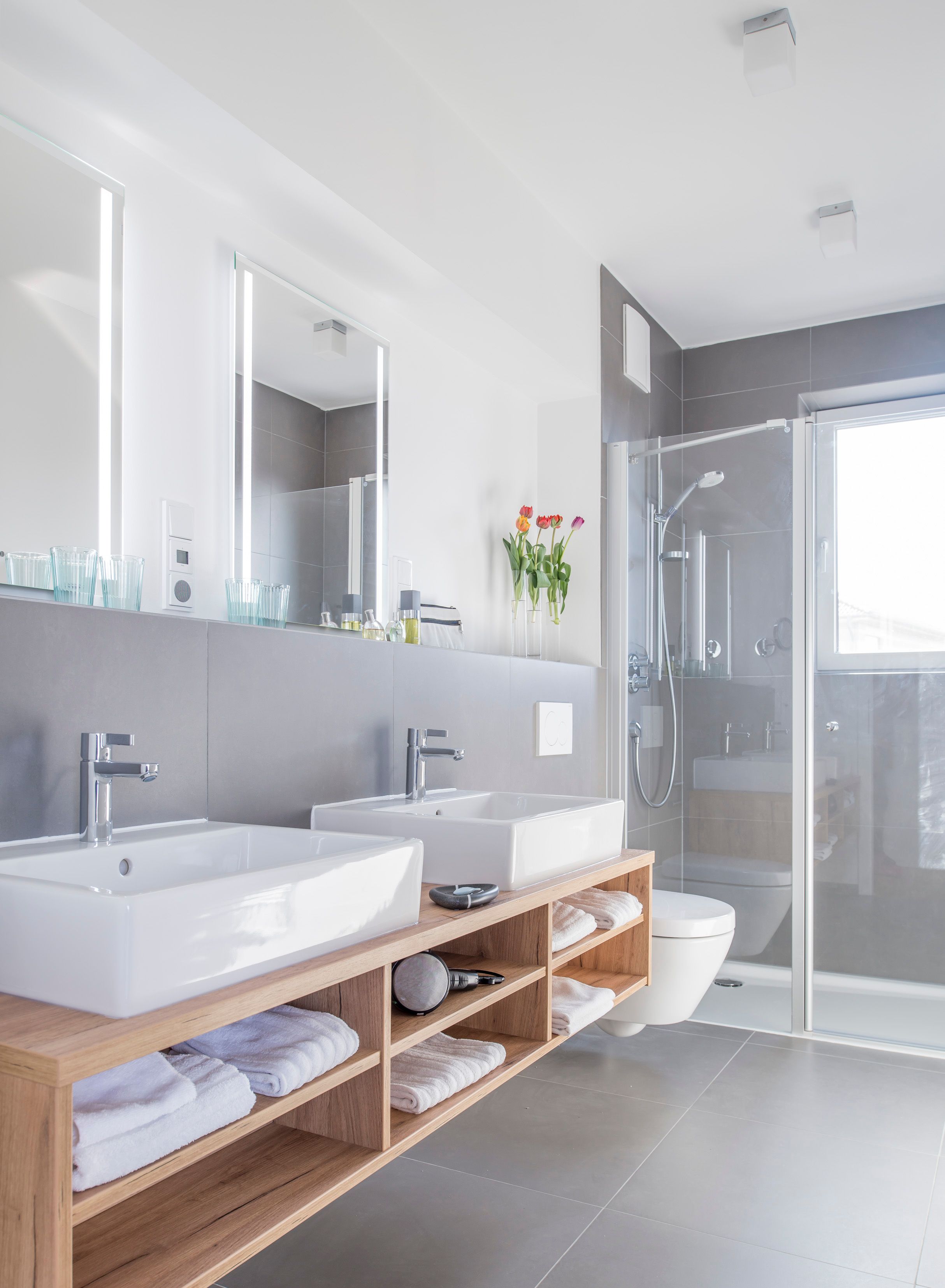 Badezimmer mit ebenerdiger Dusche, Kosmetikspiegel und Fön.
