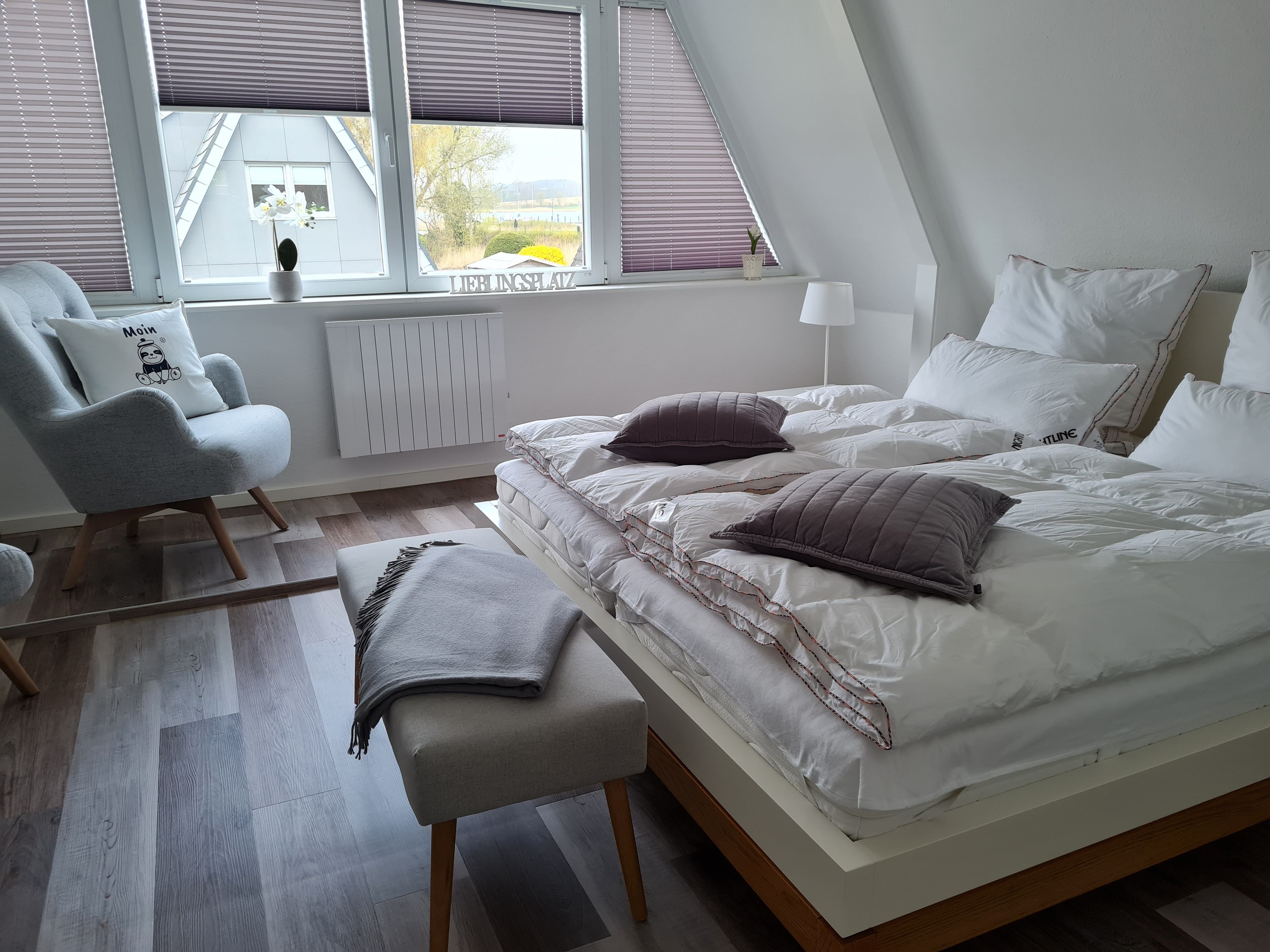 Schlafzimmer 1 mit Schlei-Blick (eingeschränkt): Doppelbett 180x200 - getrennte Matratzen, Fußende offen, Kleiderschrank und Verdunklungsmöglichkeit.