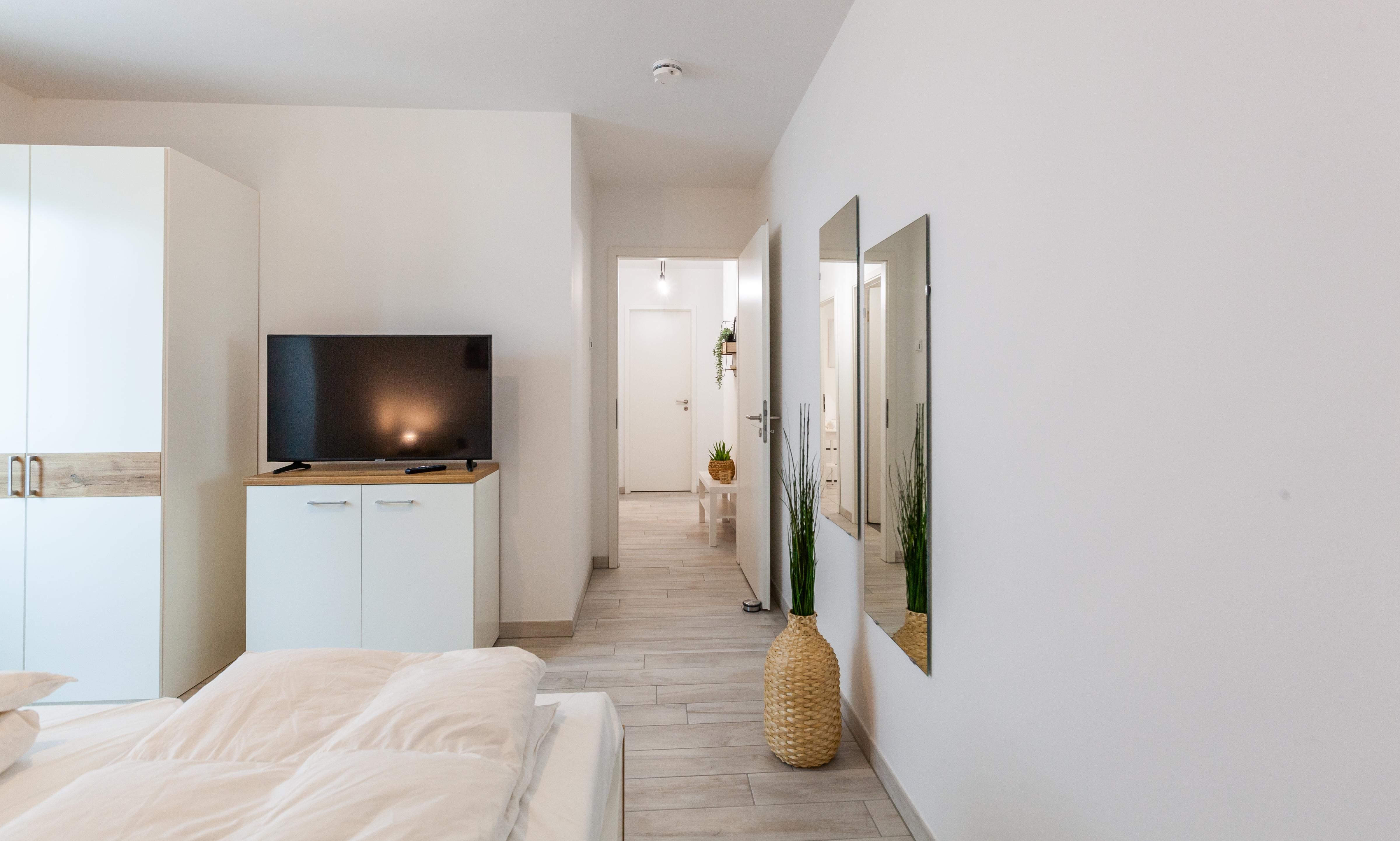 Ein Schlafzimmer mit einem Doppelbett (180x200 cm) und ein Ausziehbett (80x200 cm), Kleiderschränke und TV (in einem Schlafzimmer) vorhanden.